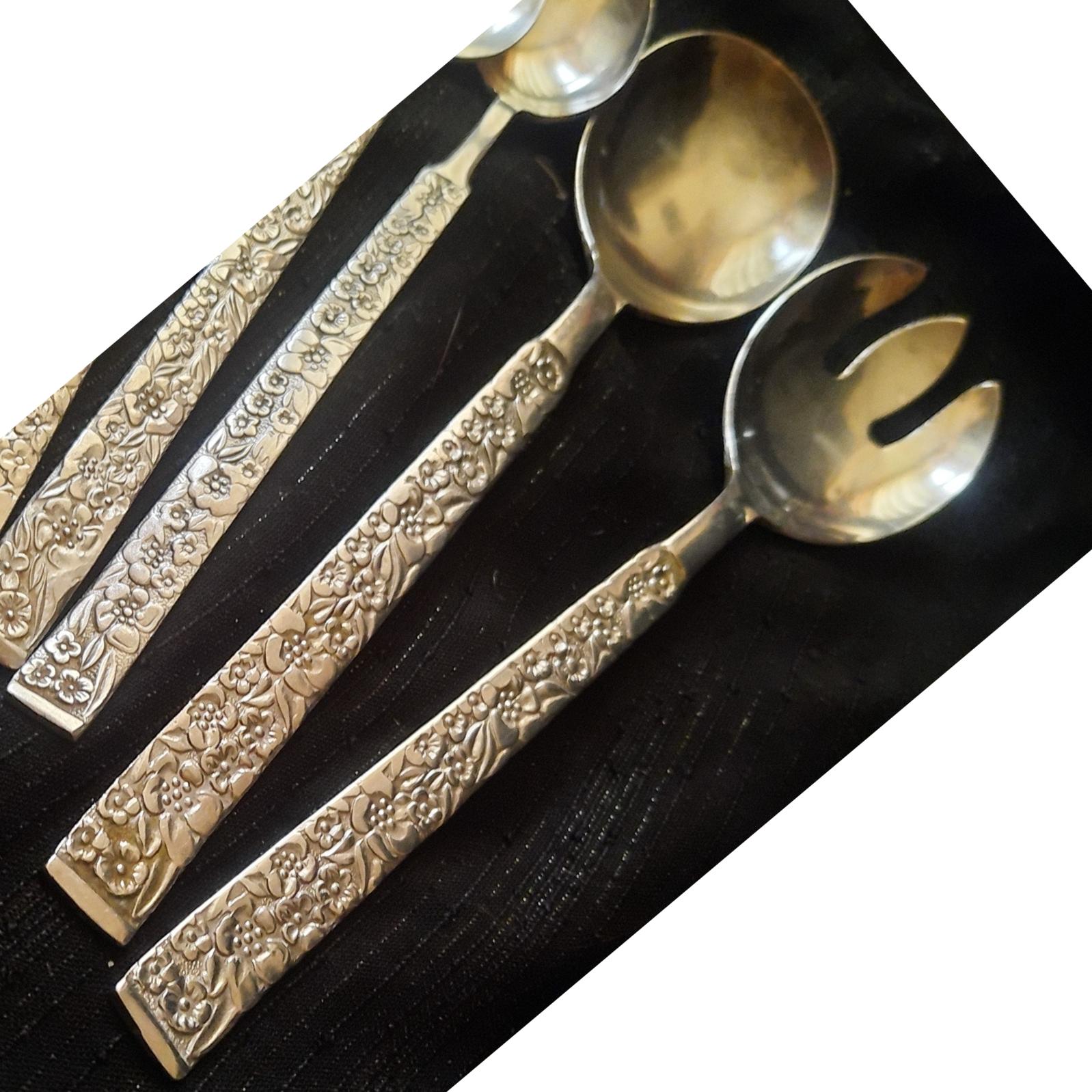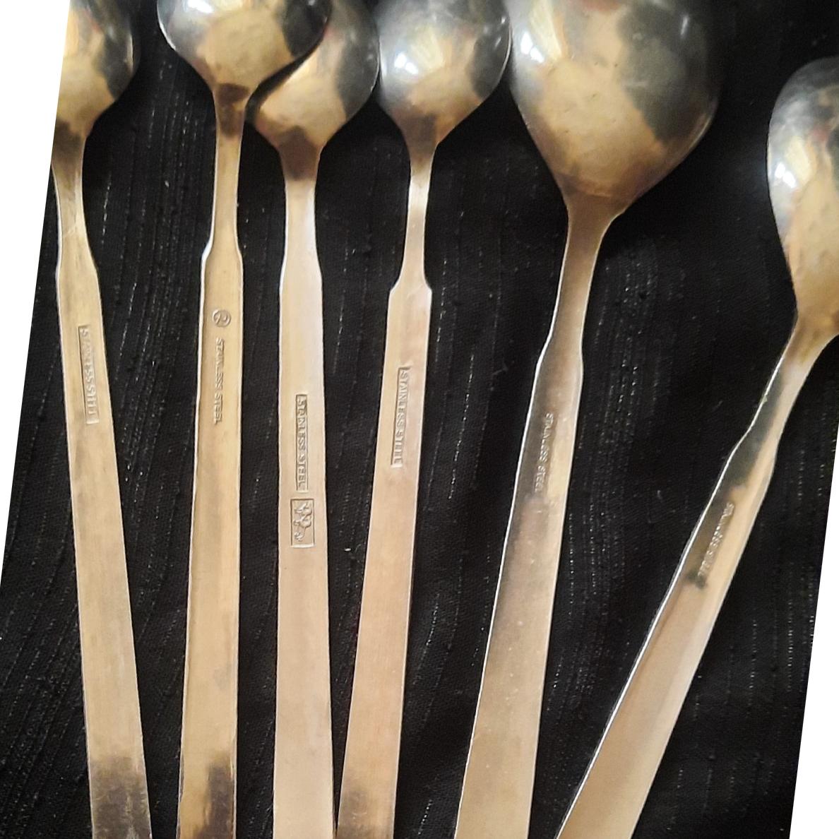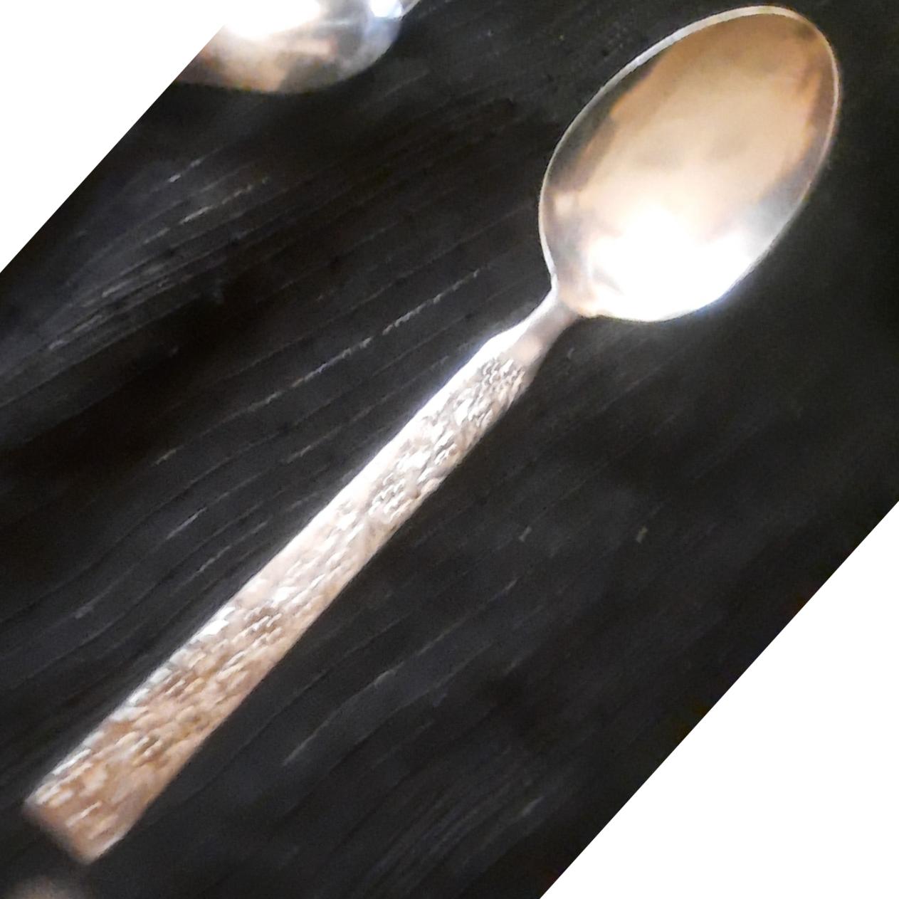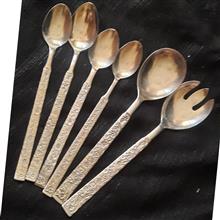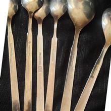 دو عدد قاشق سالاد و آجیل قد 22 سانت عمر 65 سال دست دوم قاشق آجیل کمی به سیاهی میزند خط و خش ممکن است دیده شود چهار عدد قاشق شربت اندازه و مارک متفاوت و یک قاش غذاخور اشانتیون