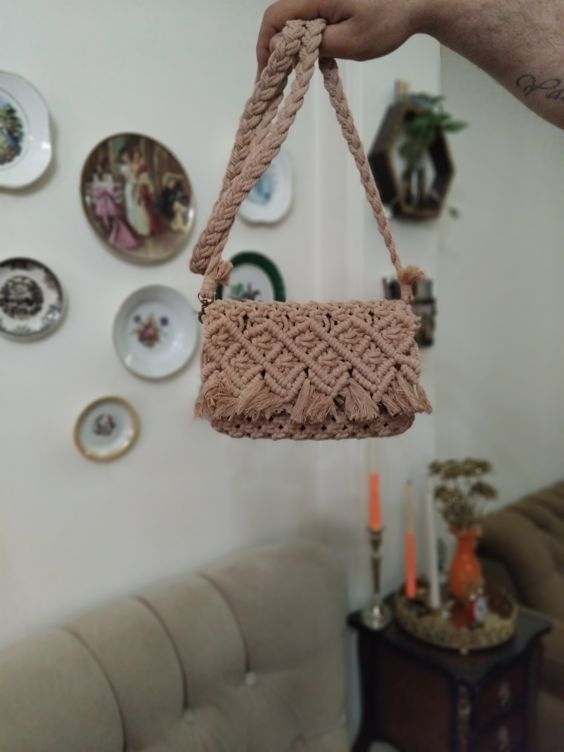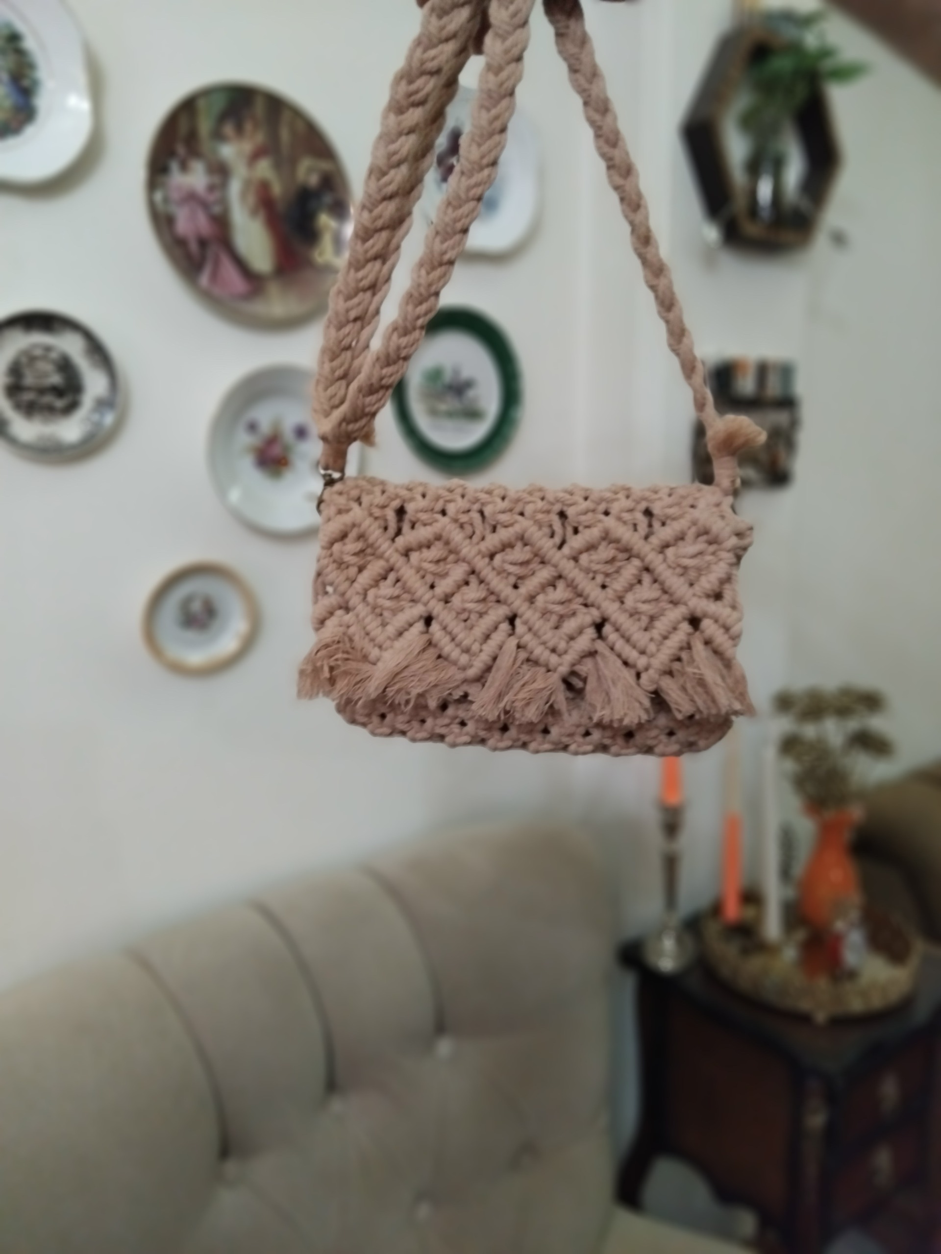 کیف دستبافت مکرومه دوشی رنگ گلبهی،طول حدودا 20سانتی،مناسب برای استفاده روزمره، گوشی وکیف پول جامیشه