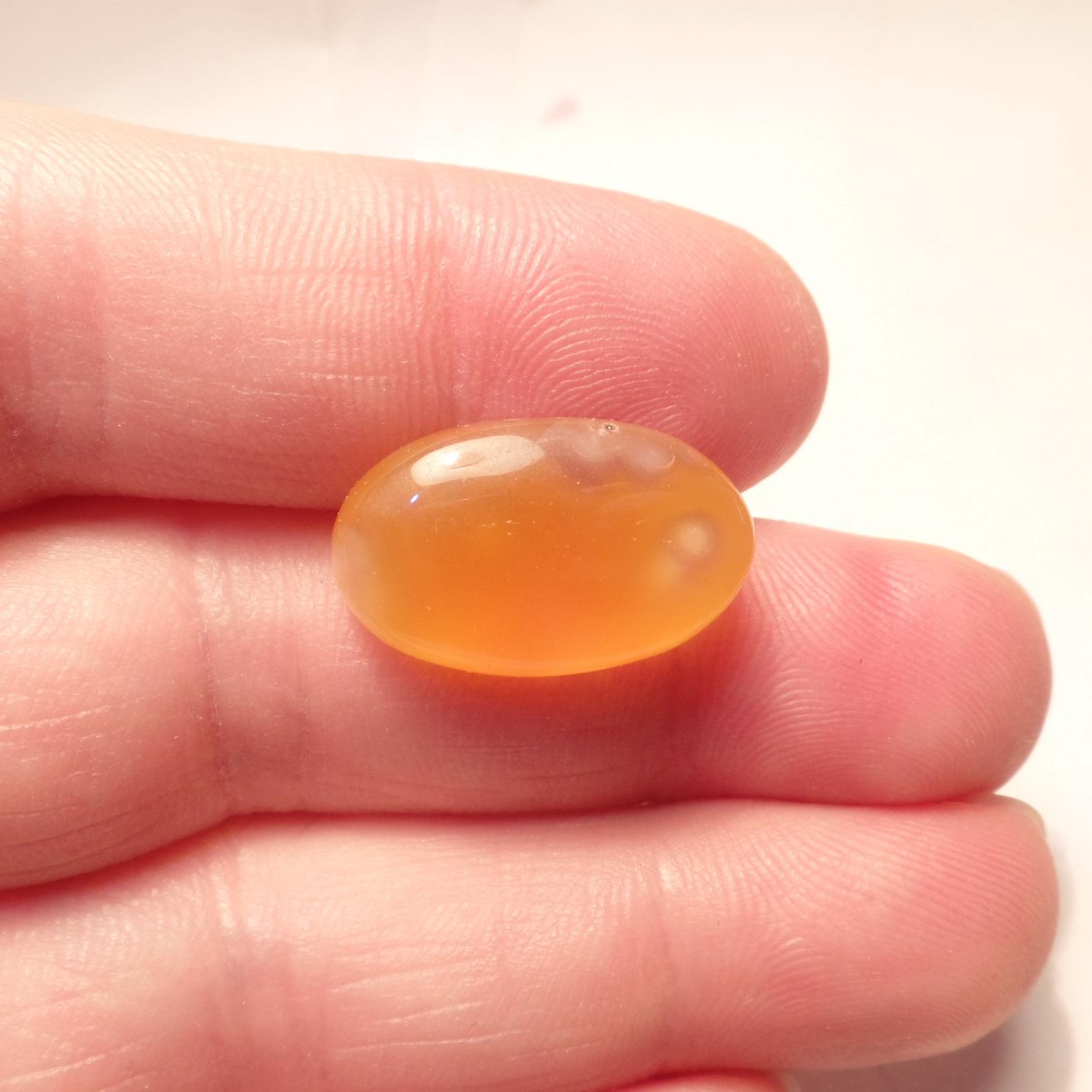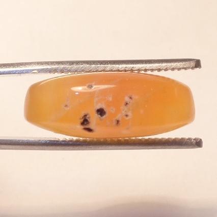 طرح : یک قطعه نگین عقیق نارنجی با لکه های سفید و خال های مشکی خوش رنگ و خوش طبع و با تراش بیضی رو و زیر محدب. پشت سنگ ذکر شریفه ( شرف الشمس ) بصورت سطحی و خراش مانند حکاکی گردیده است. در پهلوی سنگ و زیر خال های مشکی دو تا برص یخی بزرگ و مورب