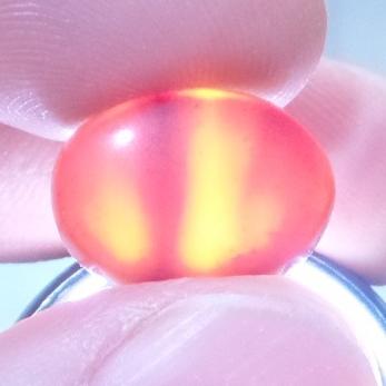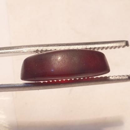 طرح : یک قطعه نگین عقیق قرمز بسیار بسیار تیره که از کثرت سرخی به سیاهی متمایل شده است خوش رنگ و خوش طبع با رگه های تیره و روشن طبیعی داخلی و با تراش بیضی دیواره دار رو و زیر نسبتا محدب. پشت سنگ نسبتا کاس میباشد ( یعنی قسمت وسط پشت سنگ کمی حالت