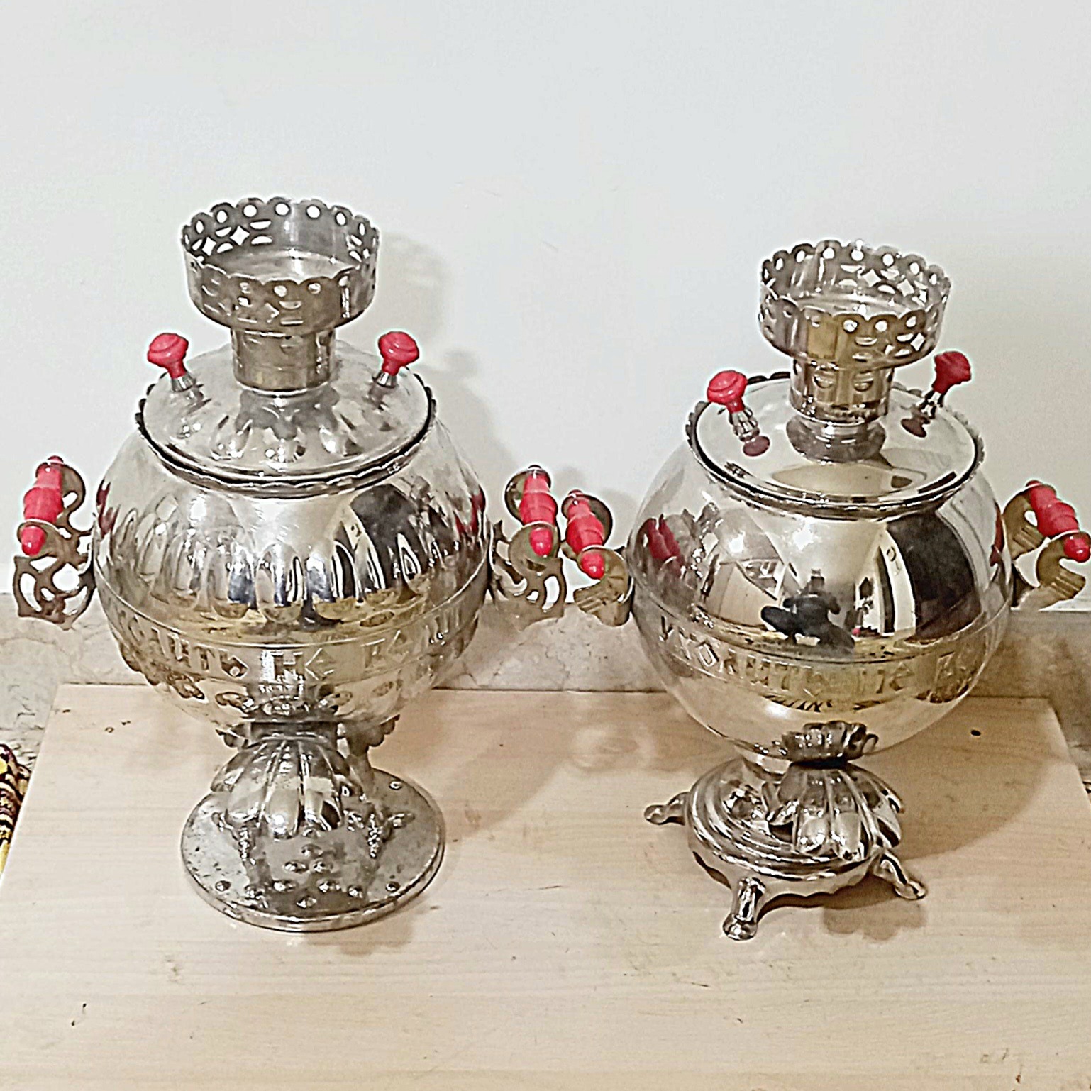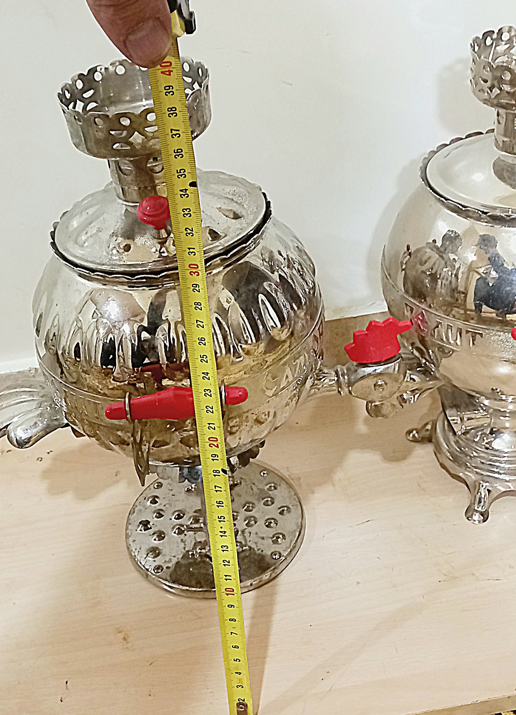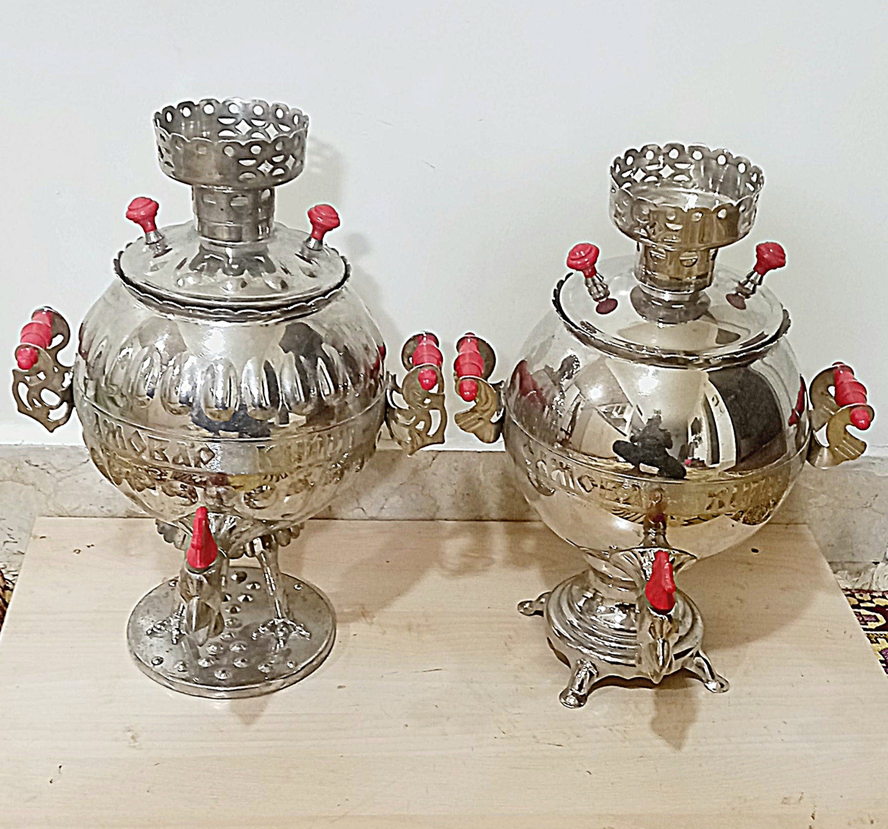یک جفت سماور بسیار کمیاب روسی مرغ و خروس قدیمی (البته جفت باهمش خیلی کمیابه ) برقی که حداقل مال 60 سال پیشه .و بسیار زیبا و کلکسیونی هستش .و از جنس برنج میباشد البته میتوان داد رنگ کرومش رو برداشت وزرد برنجی شد .درکل دقیقا مطابق تصاویر میباشد سوال و عکس بیشتر خواستین درخدمت
