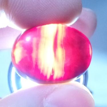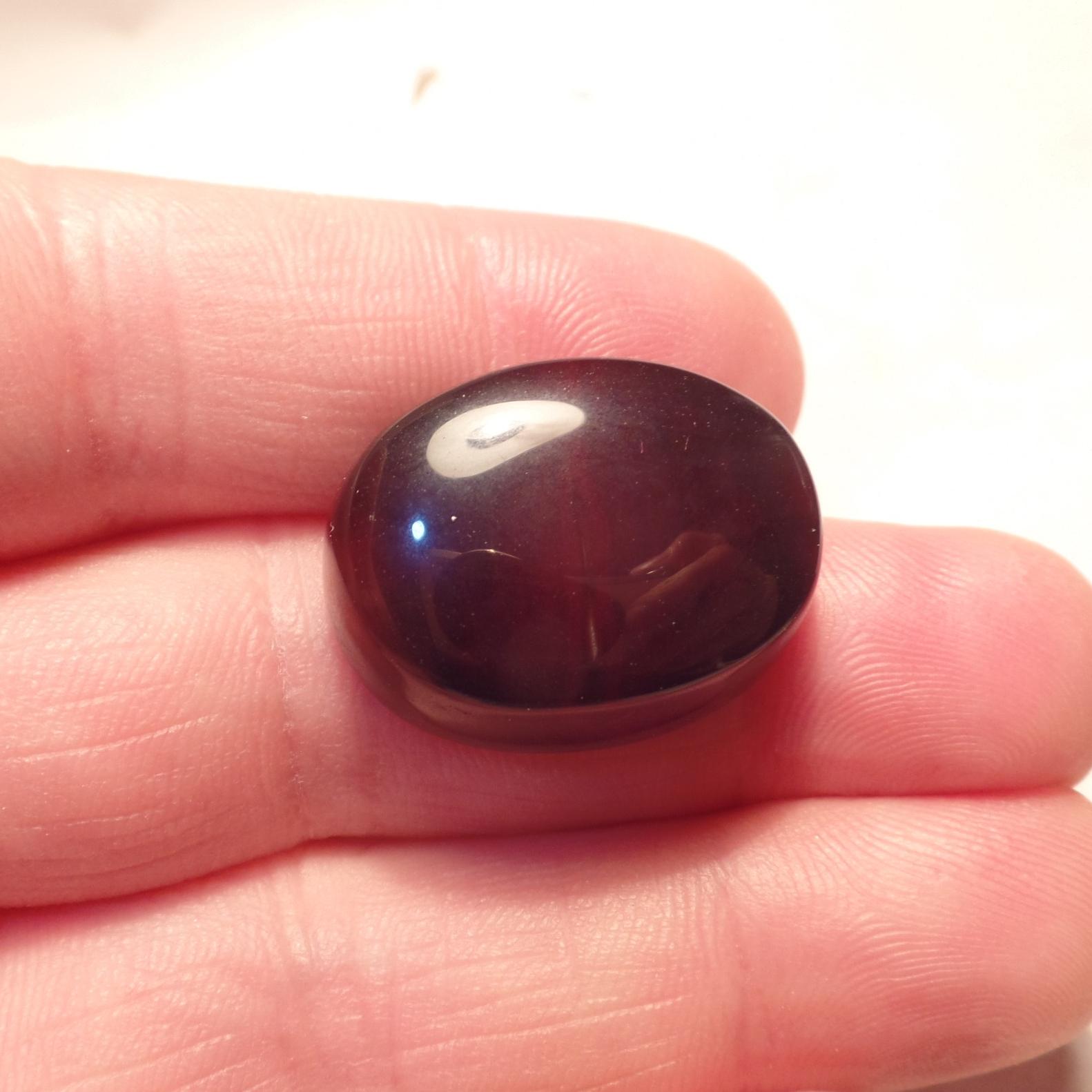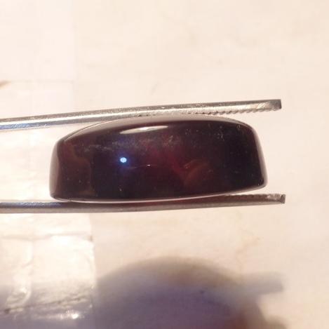 طرح : یک قطعه نگین عقیق قرمز بسیار بسیار تیره که از کثرت سرخی به سیاهی متمایل شده است خوش رنگ و نسبتا خوش طبع با رگه های تیره و روشن طبیعی داخلی زیبا و با تراش بیضی دیواره دار و ارتفاع دار و گوشتی رو و زیر نسبتا محدب.