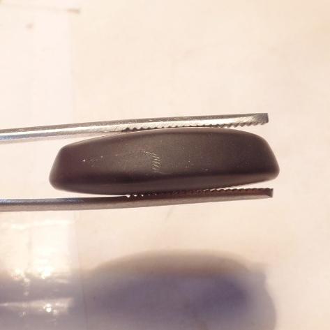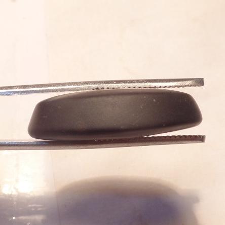 طرح : یک قطعه نگین عقیق مشکی خوش رنگ و خوش طبع و با تراش بیضی دیواره دار رو و زیر نسبتا محدب. نگین دارای تراش غیر مصقول بوده بطوریکه تمام سطوح آن حالت مات دارد ( براق نیست )  نور از داخل این سنگ تقریبا رد نمیشود. پشت و روی سنگ لکه های روشن دارد.