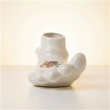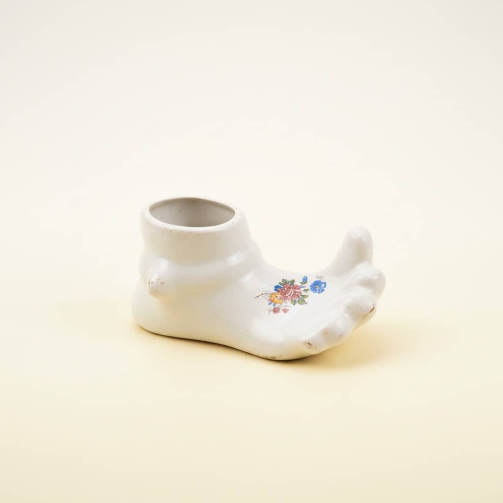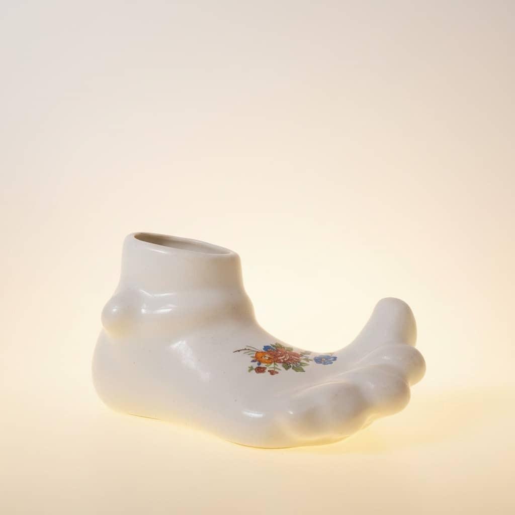 فیگور یا گلدان سرامیکی شکلات پا به طول 10 سانت.گلدار قدیمی با لعاب ترکدار.