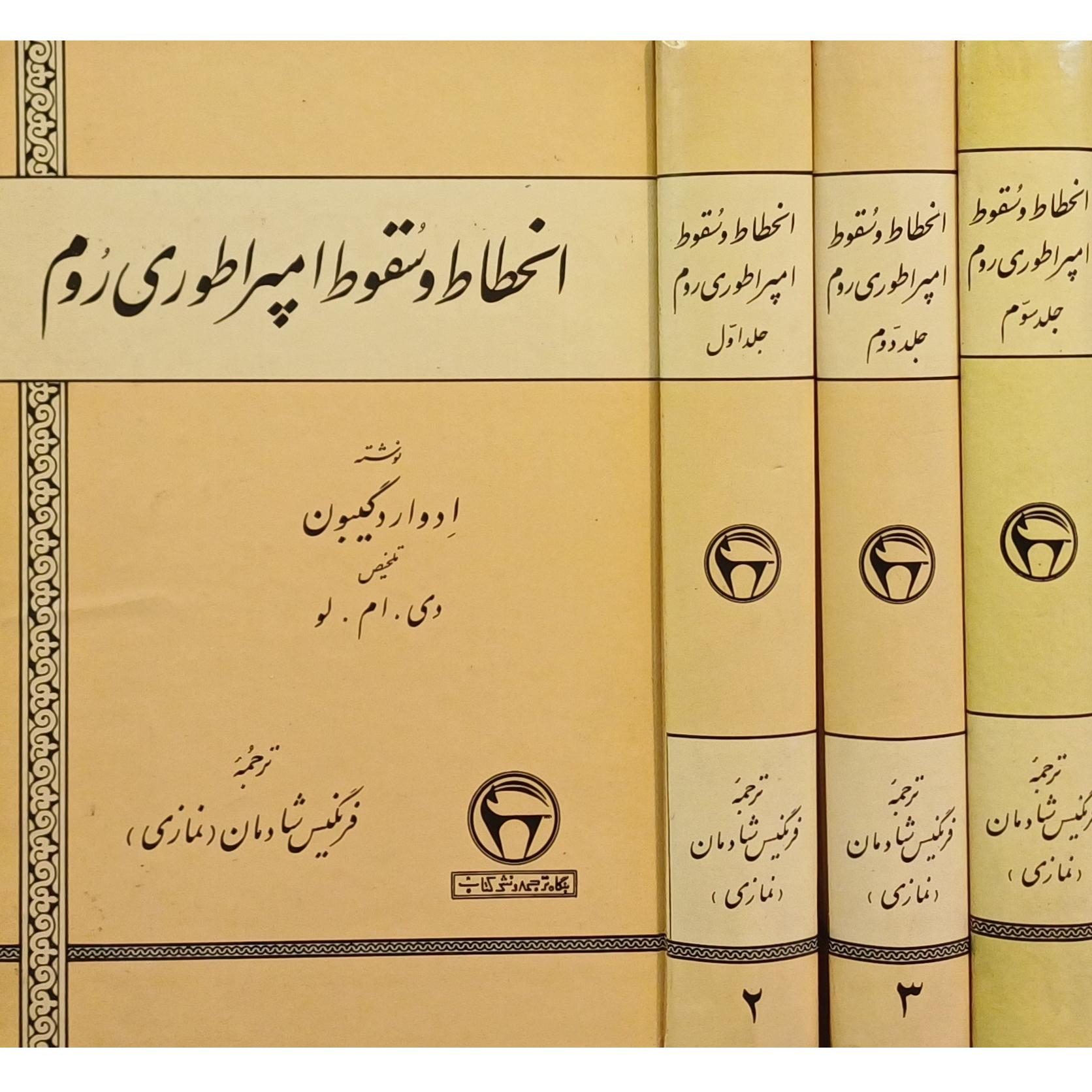 انحطاط و سقوط امپراطوری روم ، ادوارد گیبون ، ترجمه فرنگیس شادمان ، دوره 3 جلدی ، جلد سلفون ، دارای فرمان ، بنگاه ترجمه و نشر کتاب ، چاپ اول 1351/53