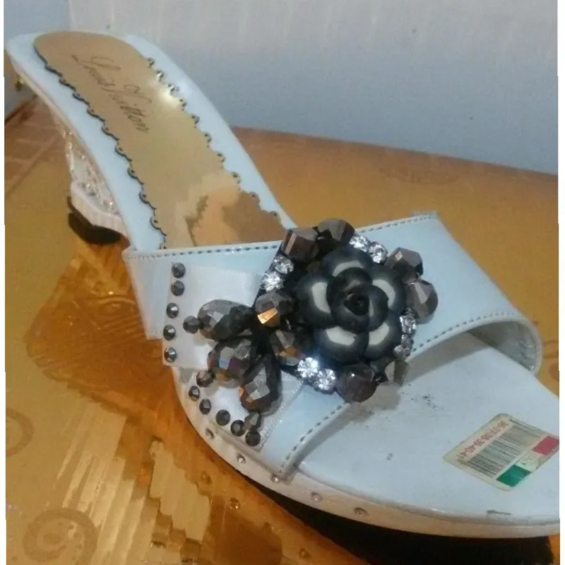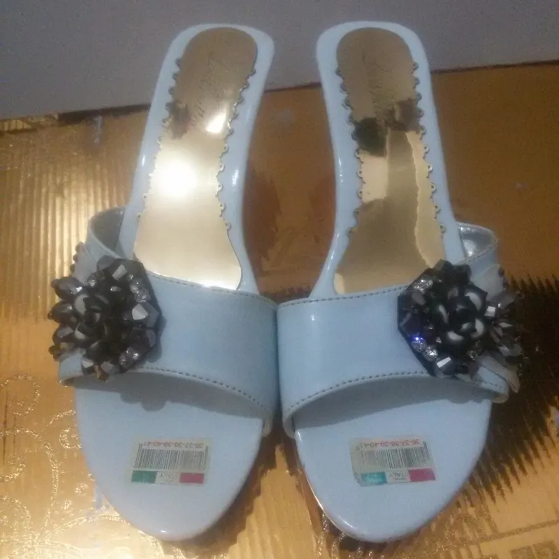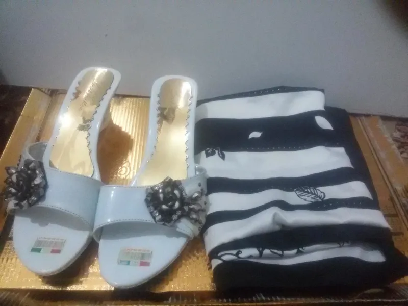 دمپایی مجلسیزنانه در حد دو سه شب پوشیده شده و در حد نو بسیار خوش پوش و شیک .نگین کاری شده با پاشنه زیبا و گل زیبای روی دمپایی...عکس آخر یک روسری هم کنار دمپایی هست که ست با این دمپایی هست و نو هست...روسری هم در آگهی ها موجود است و جداگانه فروخته میشه