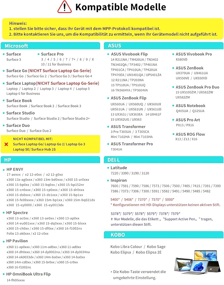 سازگاری گسترده: قلم M1 از پروتکل MPP2.0 پشتیبانی میکند و با اکثر سرفیسهای مایکروسافت و همچنین برخی از مدلهای HP، ASUS، DELL، Acer، Sony و ViewSonic سازگار است. لیست مدلهای سرفیس سرفیس پرو 3/پرو 4/پرو (نسل پنجم)/پرو 6/پرو 7/پرو 7+/پرو 8/پرو X، سرفیس بوک/بوک 2/بوک 3، سرفیس لپتاپ/لپتاپ 2/لپتاپ 3/لپتاپ 4/لپتاپ استودیو، سرفیس 3، سرفیس گو/گو 2/گو 3، سرفیس استودیو/استودیو 2