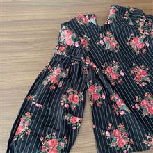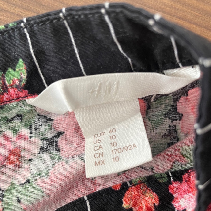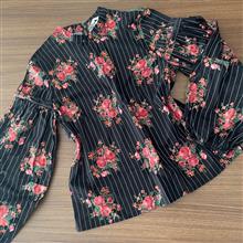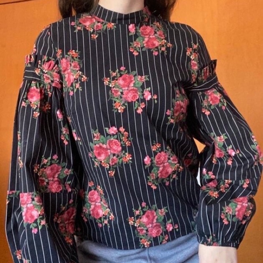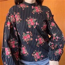 شومیز کتان بهاری، برند اچ اند ام؛ تولید ترکیه؛ مدل وینتیج؛ یقه بسته؛ پشت یقه دکمه خور؛ آستینهای پفی که در قسمت بازو چین روی آستین داره؛ دم آستین کشدوزی شده؛ مدل عروسکی و خیلی زیبا، زمینه کاملا مشکی،