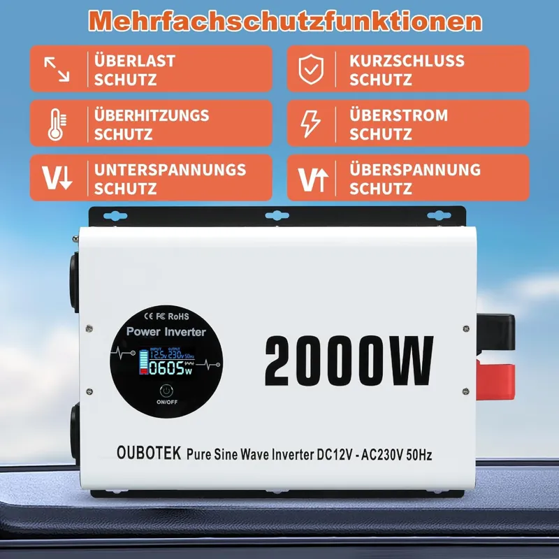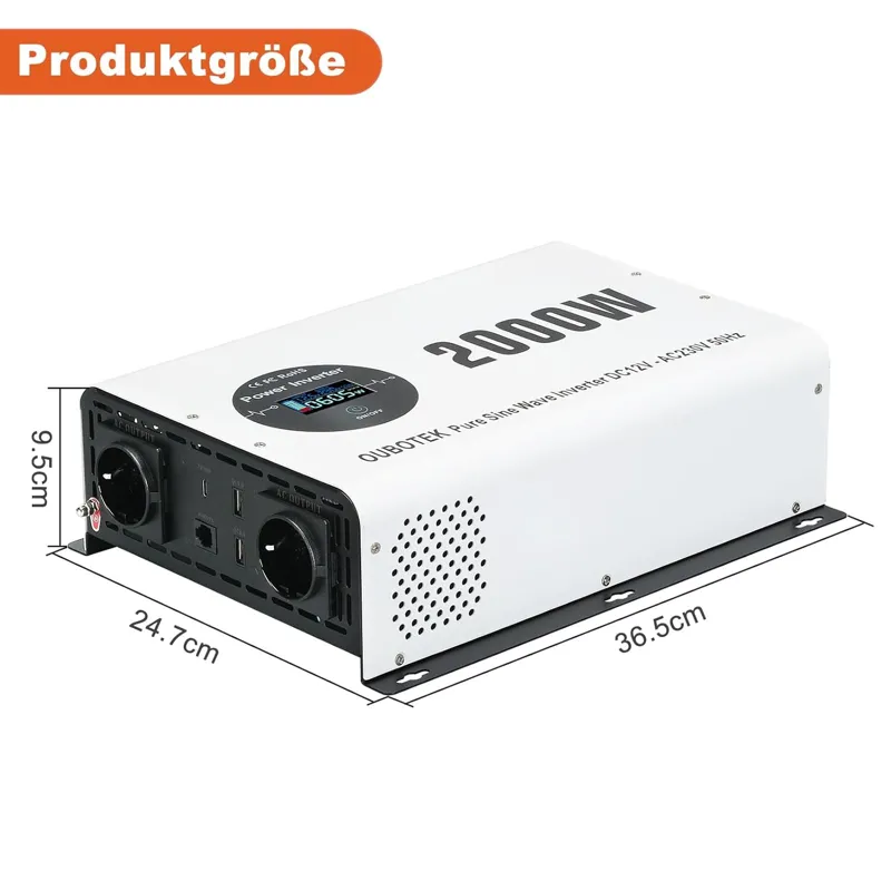 اینورتر موج سینوسی خالص تبدیل 12 ولت DC به 220 ولت، 230 ولت AC با توان مداوم 2000 وات و توان اوج 4000 وات. از فناوری پیشرفته موج سینوسی خالص برای عملکرد کارآمد دستگاه لذت ببرید.