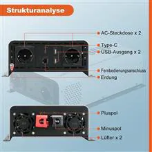طراحی کاربرپسند: اینورتر 2000 وات دارای 2 پریز برق، 2 پورت USB-A QC3.0 18 وات، 1 پورت USB-C 30 وات و یک پورت برای کنترل از راه دور است. ایدهآل برای دستگاههای حساس مانند تلویزیون، لپتاپ، تلفن هوشمند، تبلت، فریزر و روشنایی