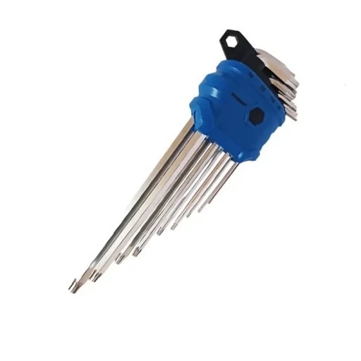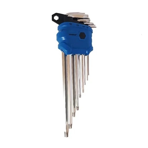 مشخصات محصول انواع محصولات با کیفیت، حرفه ای و با صرفه از کمپانی HARBOURست 9 عددی آچار آلن ستاره ای با قاب پلاستیکی شماره گذاری شدهشامل سایزهای T6 T7 T8 T10 T20 T25 T30 T40 T45طراحی و تولید شده زیر نظر استانداردهای جهانی همچون GS اروپااستفاده از آلیاژ فولادی کروم وانادیوم درجه یک برای ساخت آچارهابدنه سخت کاری شده با مقاومت عالی در برابر گشتاور و فشار زیادمجهز به روکش کرومی ضد زنگ و ضد خوردگی برای افزایش دوام ابزارسری های ماشین کاری شده و بسیار دقیق برای درگیری کامل با پیچطول فوق بلند آچارها جهت باز و بست راحت پیچ های دور از دسترس