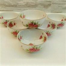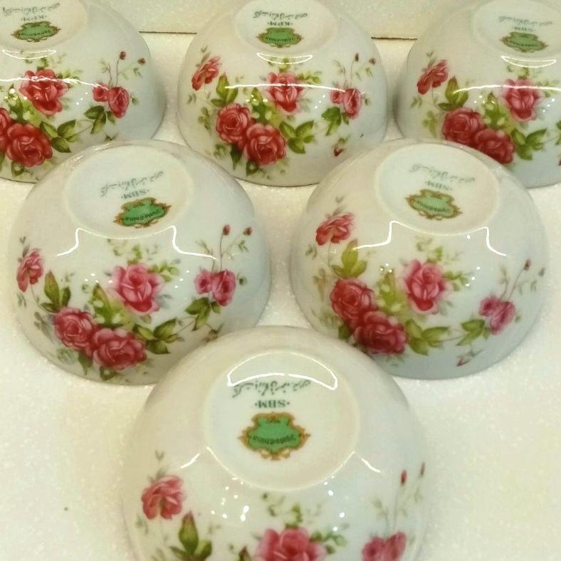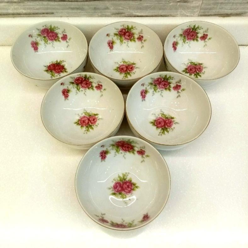 کاسه های بی کعب گلسرخی فوق زیبای بازرگانی مسعود kpm از دوره پهلوی. اندازه دهانه 10 سانتیمتر،قیمت درج شده برای 1عدد از 6عدد کاسه یا پیاله موجود میباشد.