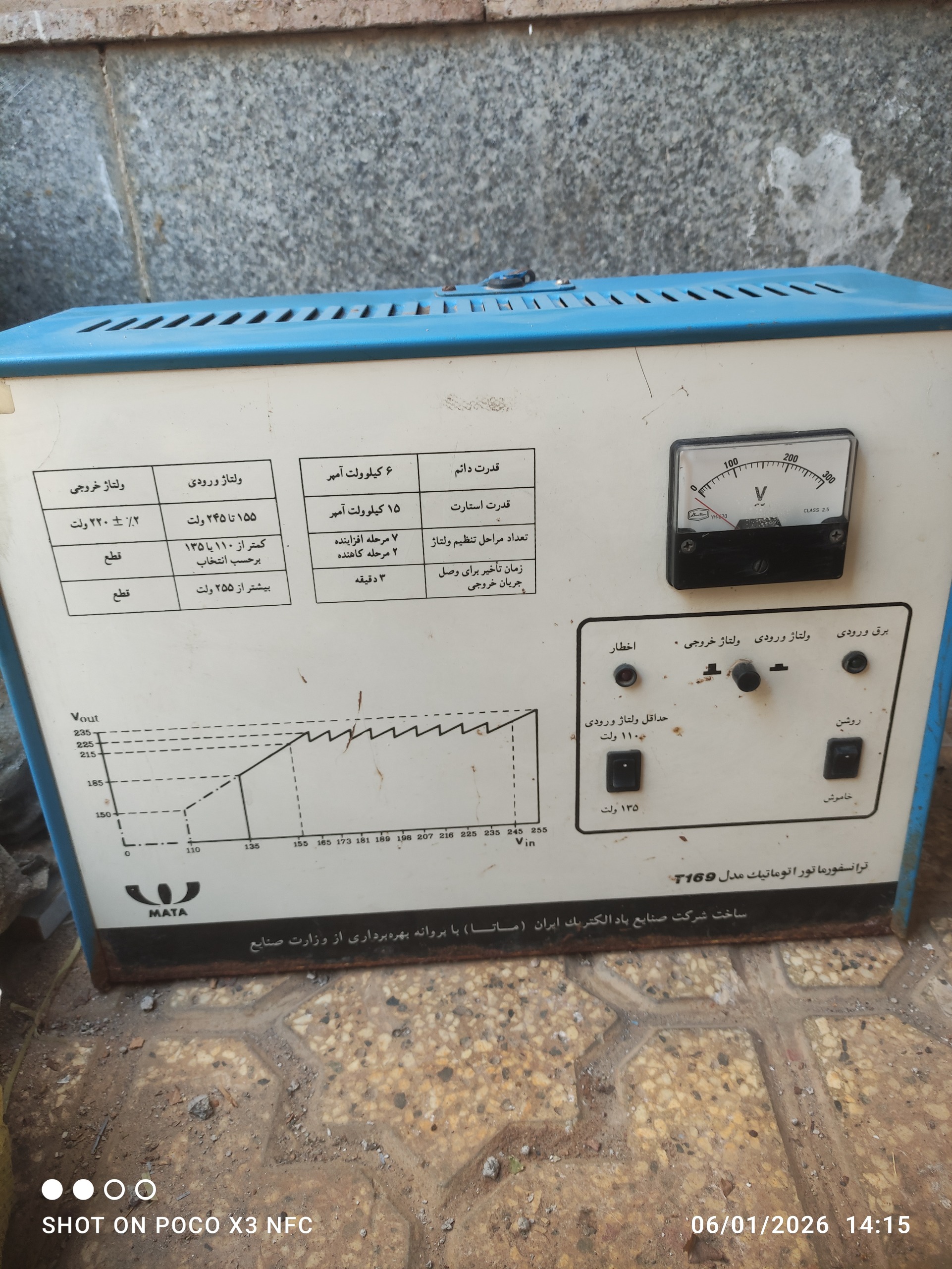 انسفورماتور اتوماتیک مدل T169 mata یک استابلایزر ولتاژ سنگینوزن با ظرفیت 6 کیلوولتآمپر (kVA) دائم و 15 kVA استارت است که نوسانات برق ورودی را به صورت خودکار تنظیم و خروجی پایدار 220 ولت ارائه میدهد.کاربرد اصلی این دستگاه برای حفاظت تجهیزات حساس برقی در برابر افت و خیز ولتاژ طراحی شده و مناسب خانهها، کارگاهها، مغازههای الکترونیک یا جواهرفروشیهاست؛ مثلاً برای یخچال، کولر گازی، ماشینهای صنعتی کوچک و... با 7 مرحله افزاینده (2 کاهنده)، گیج ولتاژ 0-300، تأخیر 3 دقیقهای و کلید حداقل 110 ولت، از آسیب به لوازم جلوگیری میکند و مصرف برق را هم بهینه میسازد.دستگاه تمیز هست زیاد کار نکرده و چند ساله که کنار گذاشته شده و دستگاه خیلی سنگین باسیم پیچ بزرگ هم هست