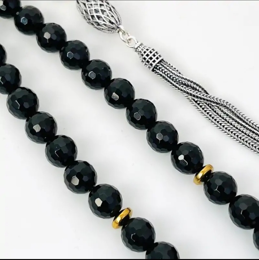 مهرهها از سنگ طبیعی عقیق (Black Agate) انتخاب شدهاند؛ تفاوتهای جزئی در رگه/بافت هر مهره طبیعی و نشانهی اصالت آنهاست.