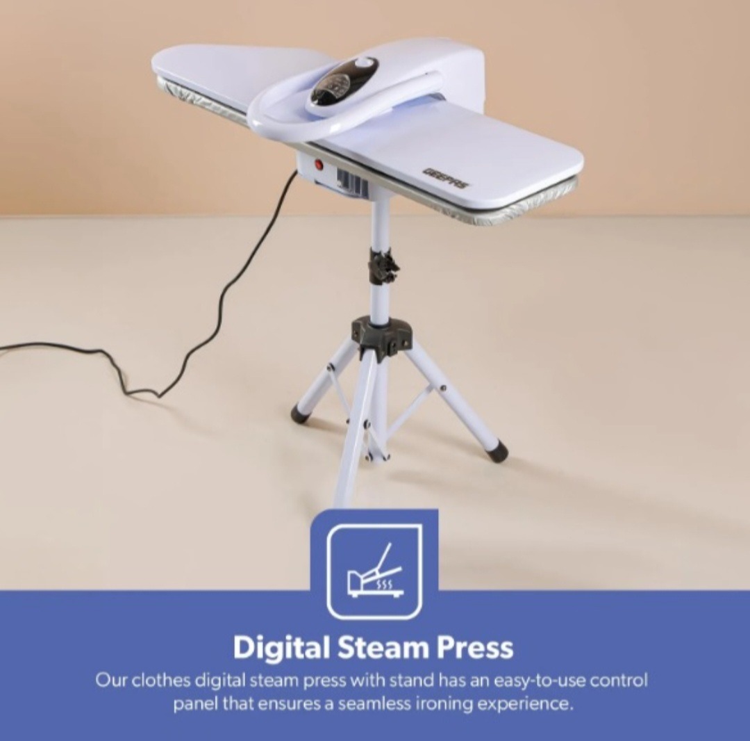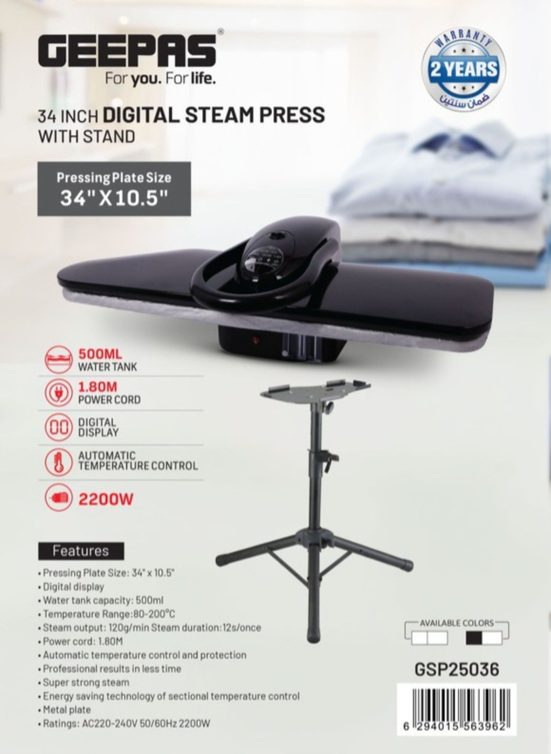 اتو بخار دیجیتال 34 اینچی با پایه، مجهز به صفحه فلزی 34 در 10.5 اینچ، مناسب برای انواع پارچه و ایمن برای پارچههای ظریف، مخزن آب 500 میلیلیتری، کنترل خودکار دما 500 میلیلیتری، 2200 وات، GSP25036