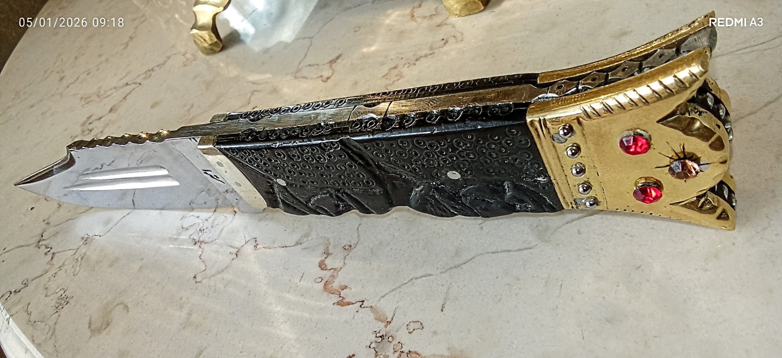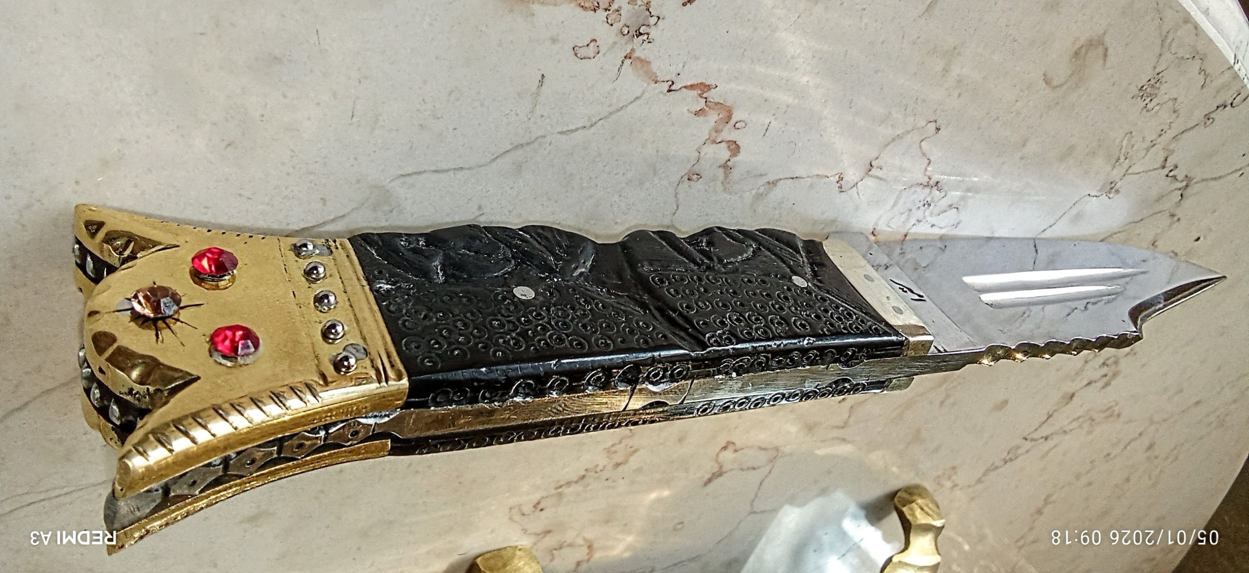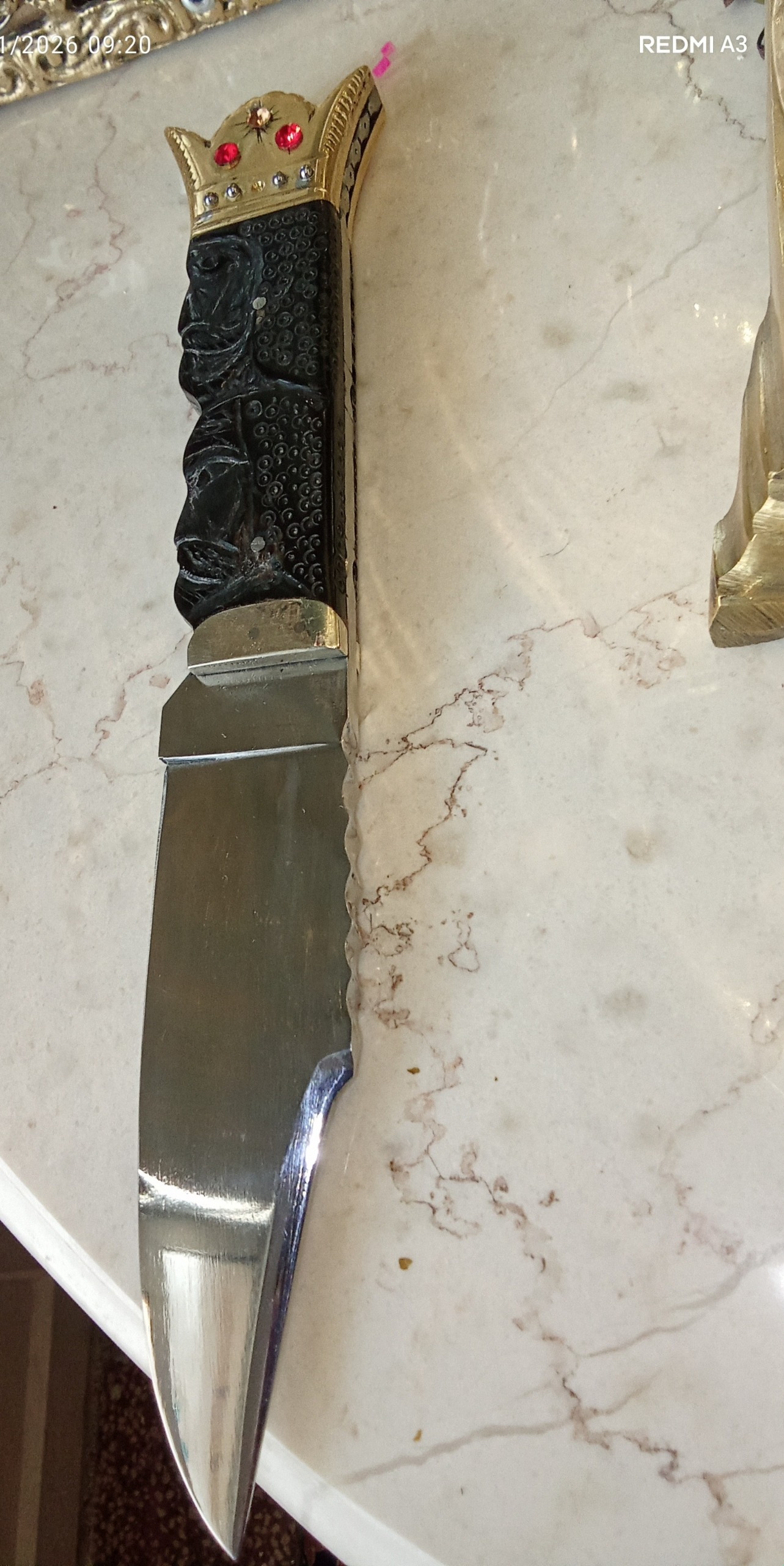 چاقو شکاری کلکسیونی وسفارشی دسته شاخ گاومیش کنده کاری شده دستساز کاراستادامیرمحمدبیستونی طرح پادشاه وشیخ تاج وباربند برنز وسنگین سنگ فسفر ویاقوتی وتیغع فنر جیپ آبدیده تیزوبرا تضمینی سایز 30 سانت وقیمت اینکار زیرقیمت سازنده میباشدوخواهشا تقاضای تخفیف نفرمایید