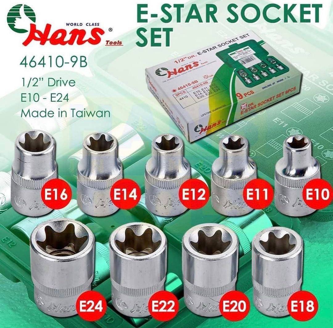 جعبه بکسE هنس مدل 46410-9B دارای 9 عدد بکس در سایزهای E10/ E11/ E12/ E14/ E16/ E18/ E20/ E22/ E24 بوده که برای باز و بسته کردن انواع مهره ها استفاده می شود.