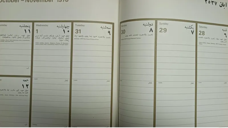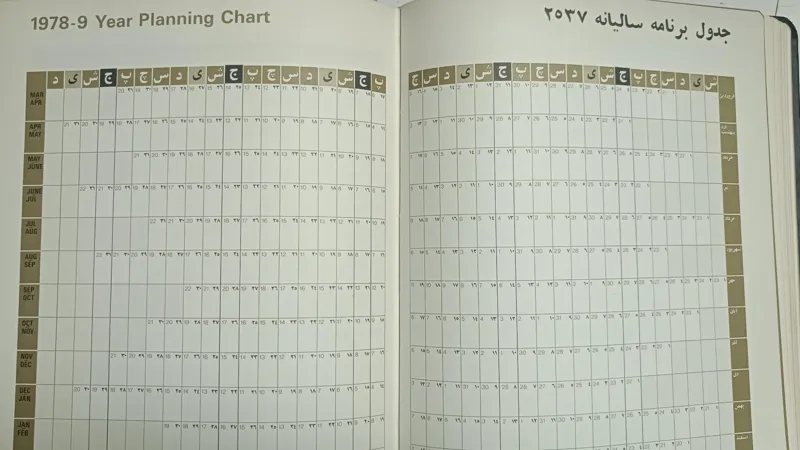 پهلوی نیز به چشم میخورد .سراسر این سالنامه از جدول هوایی برای برنامه ریزی و جمع بندی های گوناگون میباشد.و صفحه بدرقه کتاب یک نقشه جهان بسیار با کیفیت و همچنین در انتهای کتاب نیز بصورت تفکیکی نقشه کل کشورهای دنیا را آورده است.بسیار با کیفیت و آنتیک میباشد.اگر