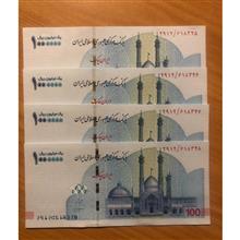 4 عدد اسکناسهای 100هزارتومانی فوق نو وکسر یکسان و سریال ان ردیف ان میباشد و بسیار استثنایی...