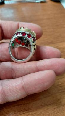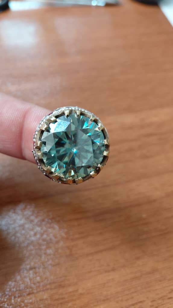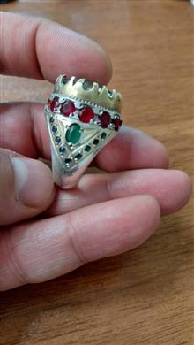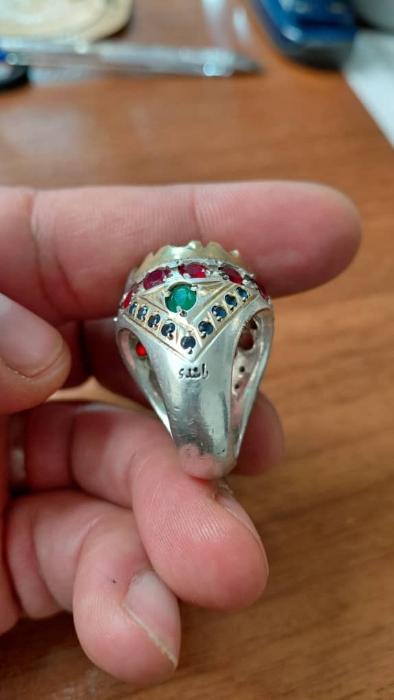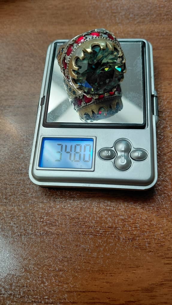 انگشتر موزینایت روسی به وزن 34گرم 80سوت کار دست با نگین بسیار درشت موزینایت و 12 عدد یاقوت سرخ و 2 عدد زمرد کلمبیا و 18 عدد یاقوت لاجوردی ریز در تنه انگشتر مخراجی شده یک کار استثنایی.