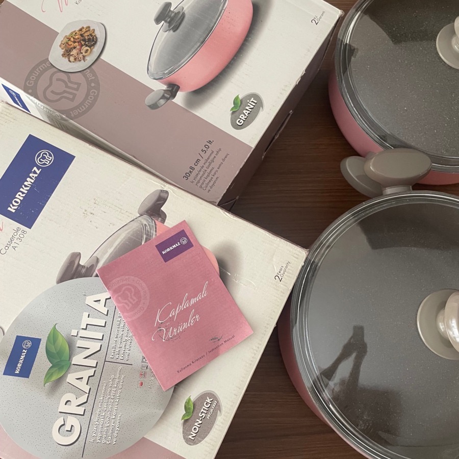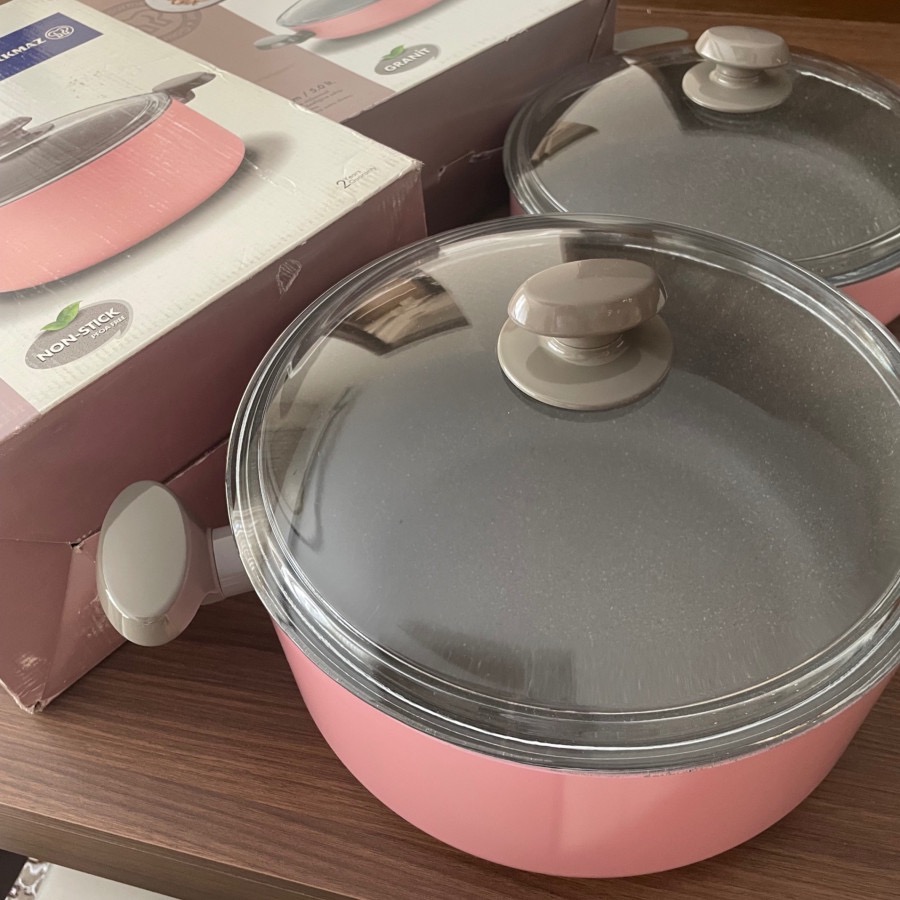 ست قابلمه و تابه گرانیت برند کرکماز ترکیه مدل میا مانولیا صورتی، در حد نو واقعی، فقط و فقط 2 بار استفاده شده، بدنه و داخل ظرف کاملا سالم و بدون ایراد، کف ظرف خط بسیار بسیار جزیی که چون کف محصول هم کاملا رنگ هست حتی محصول نو هم همون بار اول و دوم دچار خط