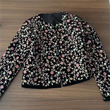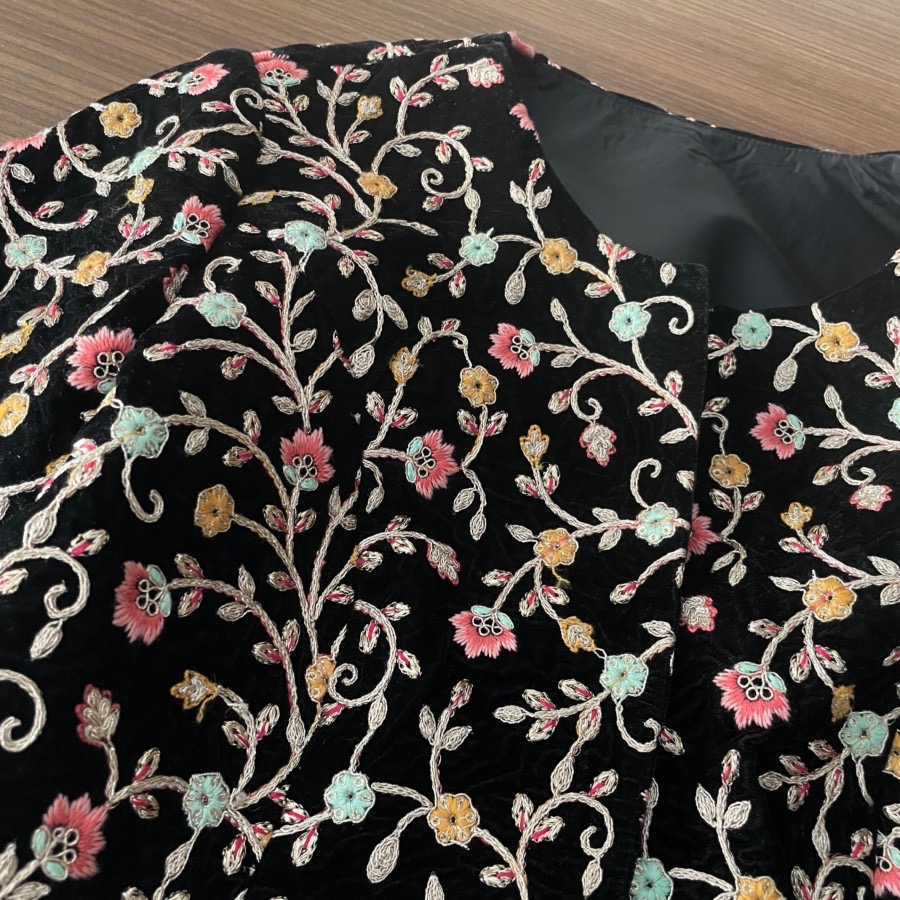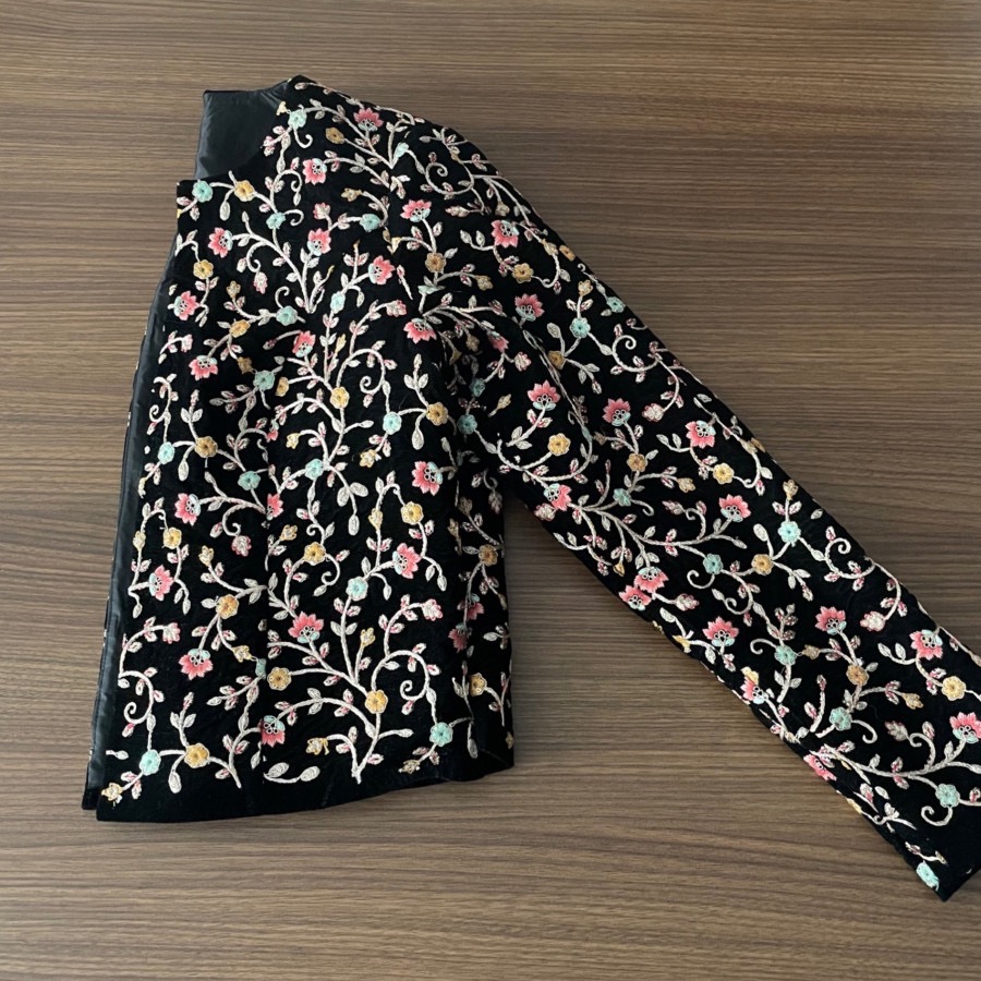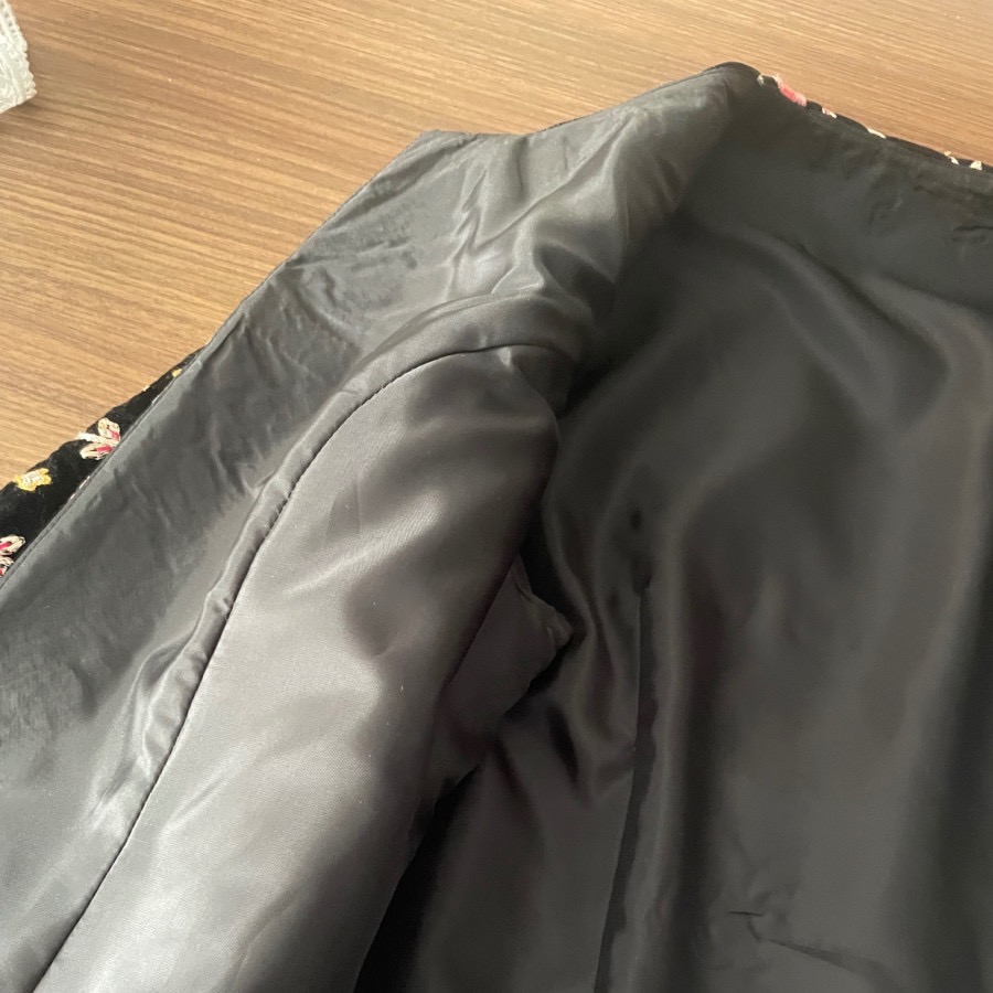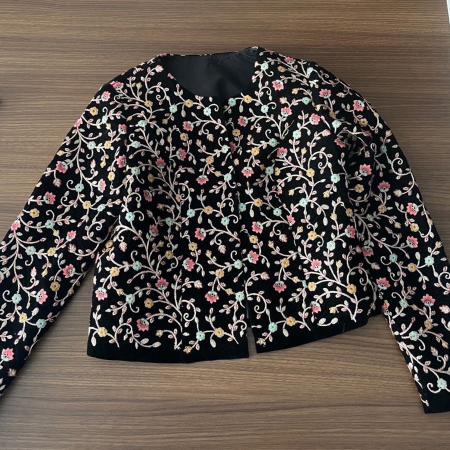 کت تک کراپ، پارچه مخمل بسیار پرکار و شیک، شخصی دوز مزونی، داخل کار آسترکشی و دوخت بسیار با کیفیت و تمیز، کاملا نو، مناسب سایز 36 و 38 ظریف، بایه شلوار یا دامن مخمل یاتافته مشکی بینظیر میشه، زیباییش اصلا توی عکس مشخص نیست متاسفانه ، رنگ زمینه کاملا مشکی، تنخور بسیار عالی که کاملا روی تن میشینه، جلو دکمه یا قزن نداره