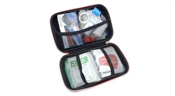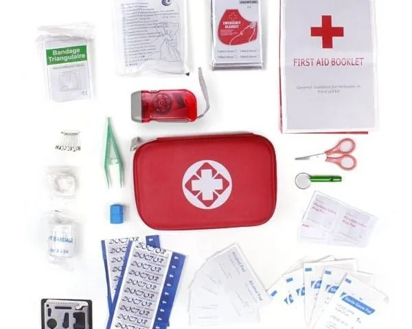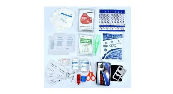 محتویات:چسب زخم، پنس، گاز استریل،باند کشی، باند زخم، چسب باند، پد الکلی، سوت، سنجاق قفلی، بروشور آموزشی، پتوی نجات، قیچی، چسب حلقه ای، چراغ قوه، کمپرس یخ و شریان بند