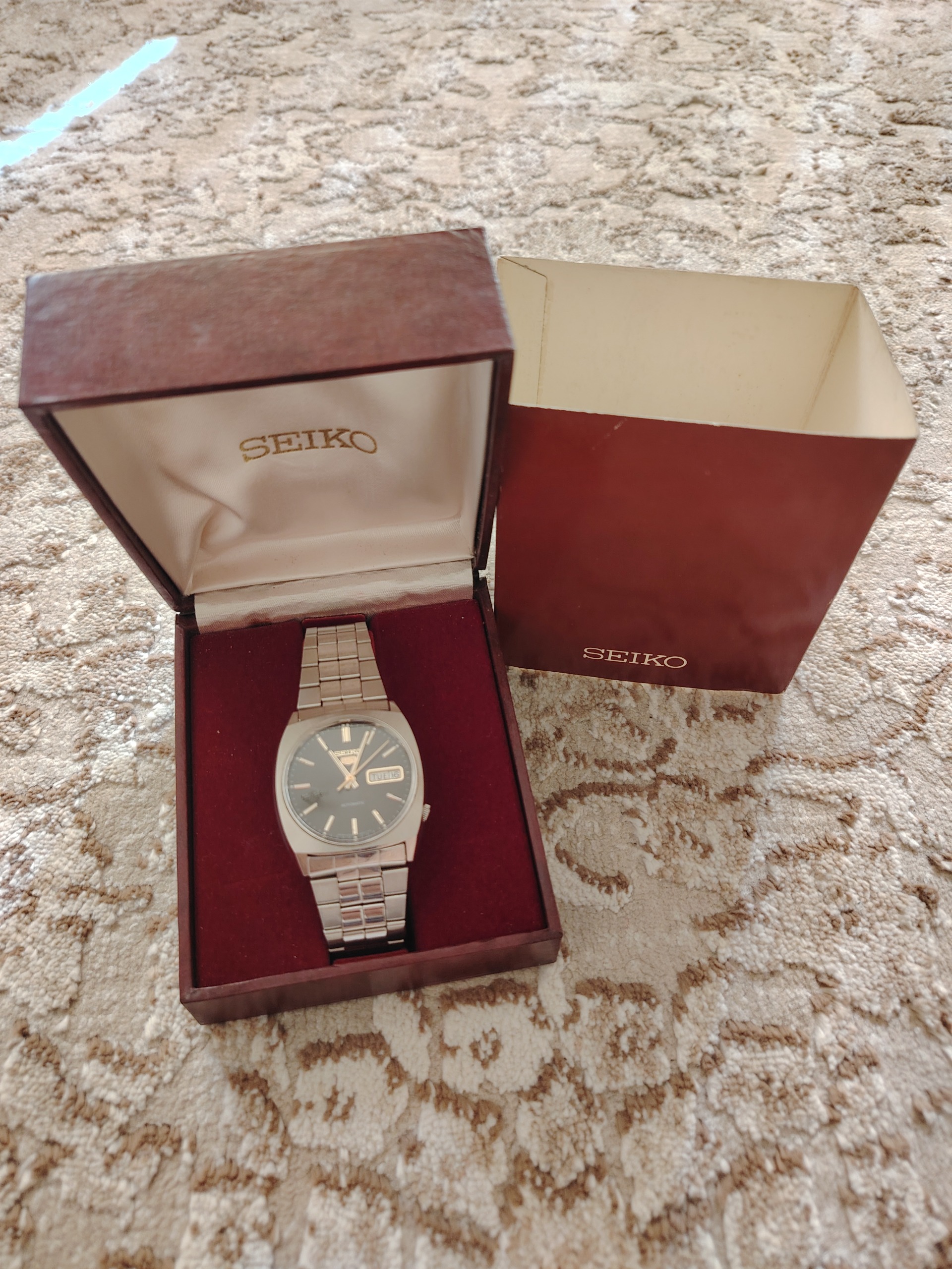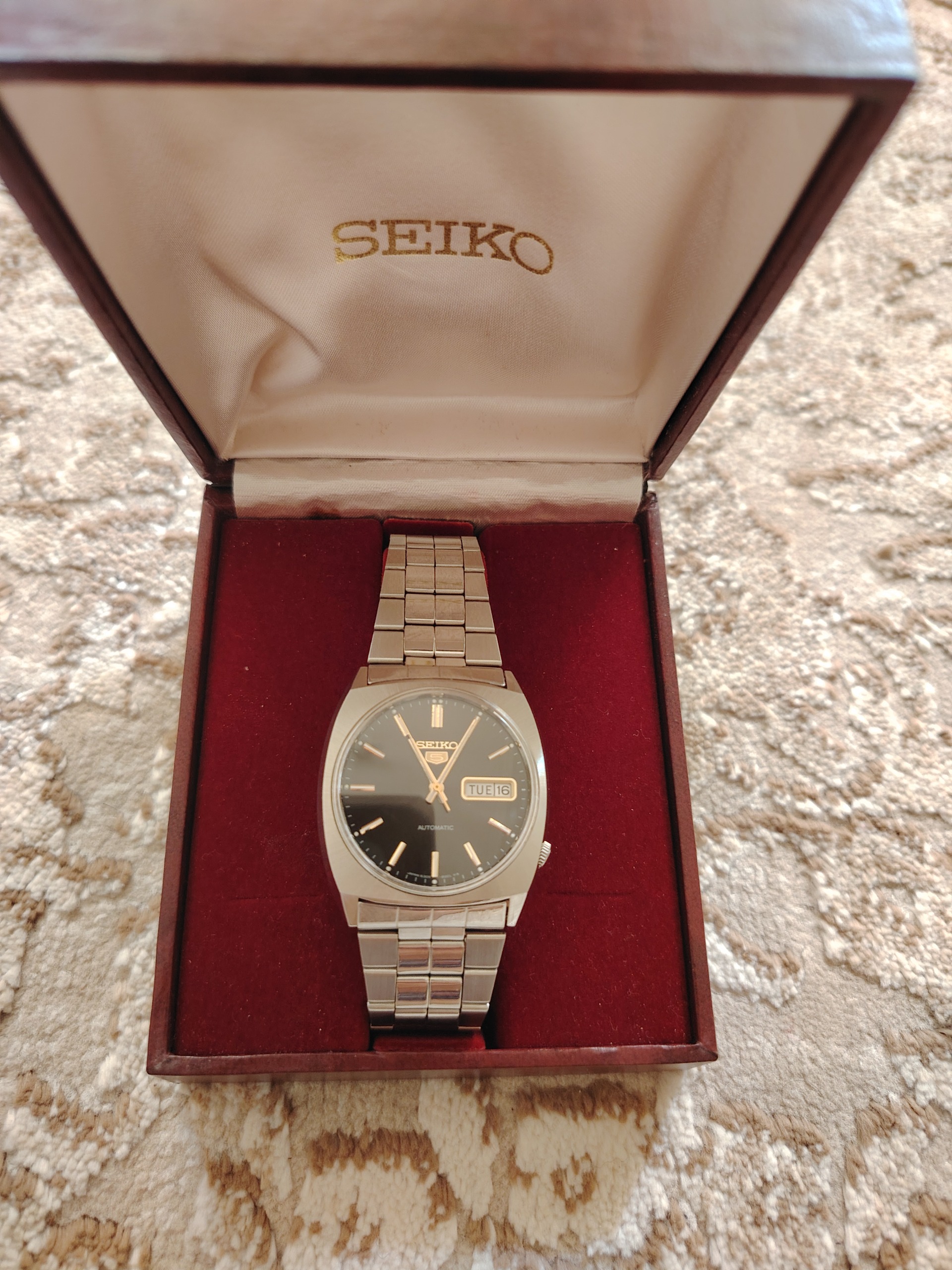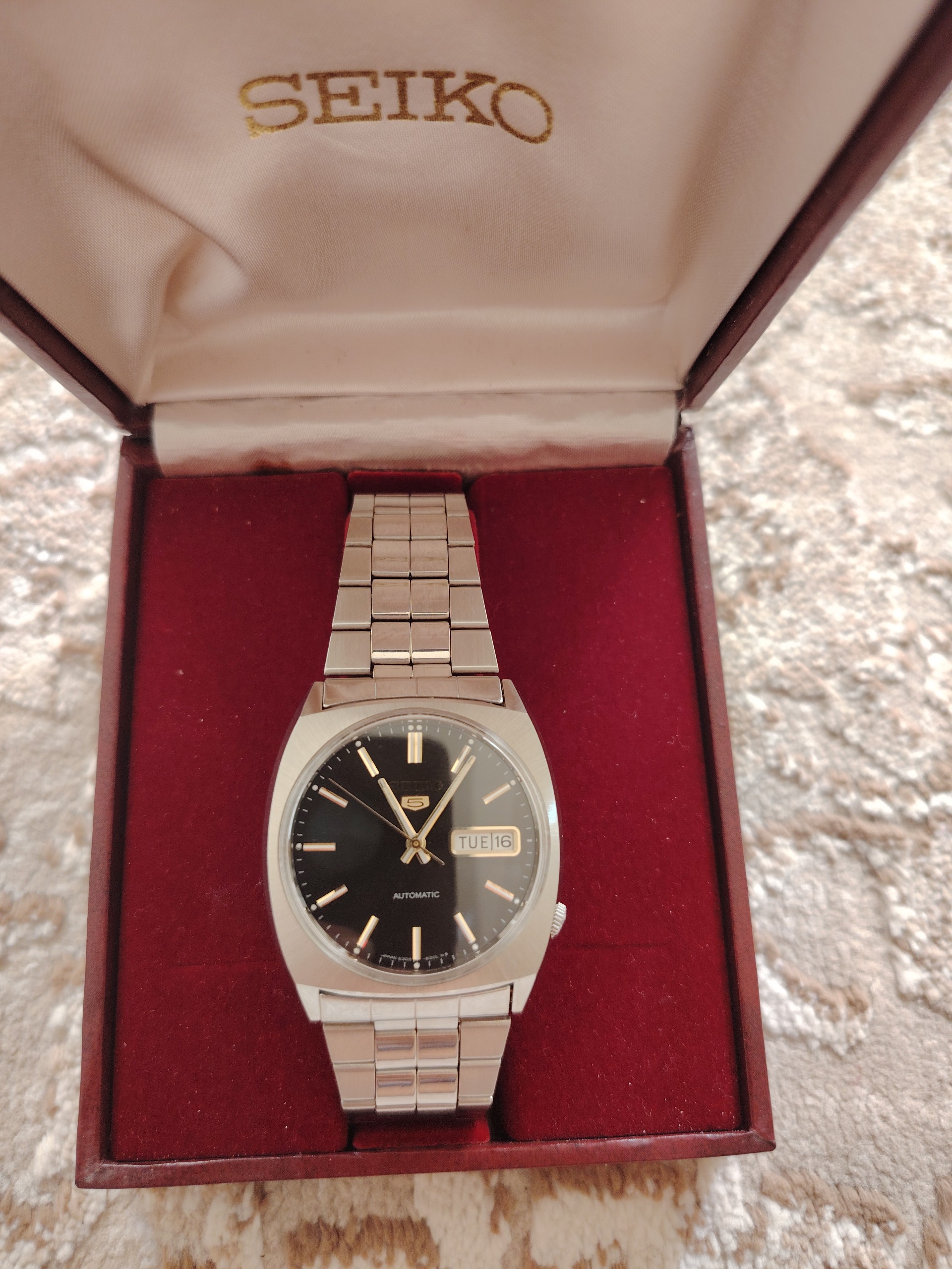 ساعت مچی مردانه برند معروف سیکو5 ژاپنی کالیبر 6309 یکی از بهترین و با دوام ترین کالیبر شرکت سیکو تولید 1981 میلادی آکبند رنگ صفحه مشکی و عقربه و عداد ها و لوگوی سیکو 5 طلایی