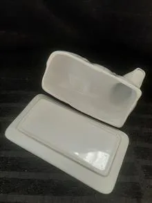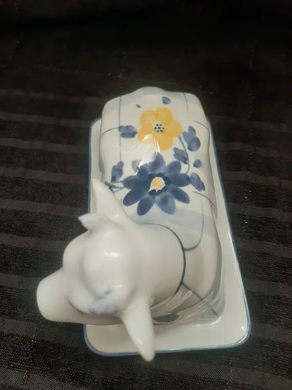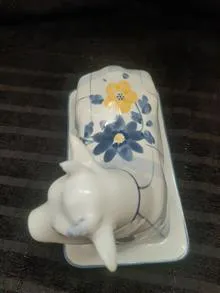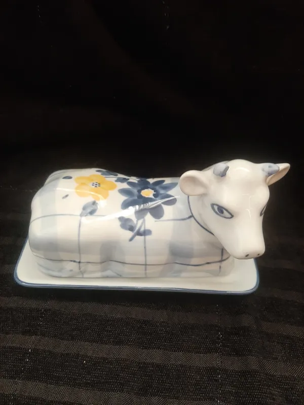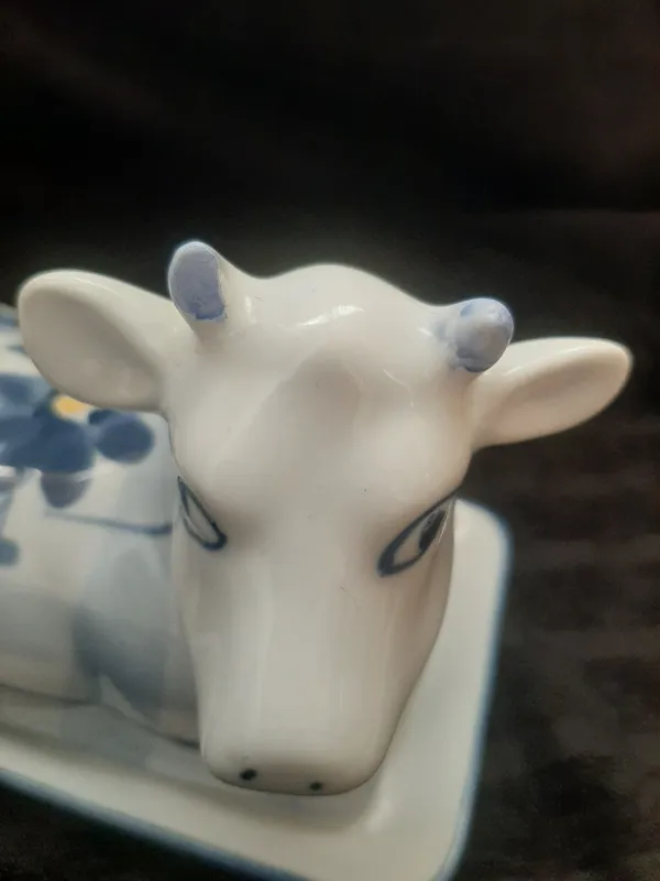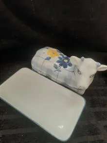 کره یا پنیر خوری گل پنبه طرح گاو طرح کمرنگ تر از نوعهای دیگه است مطابق با عکس سایز زیر 18 در 10 و ارتفاع 12 همه جا سالم فقط یک شاخ گاو یک قسمتی پریده که با دست کشیدن متوجه میشید در ظاهر اصلا پیدا نیست