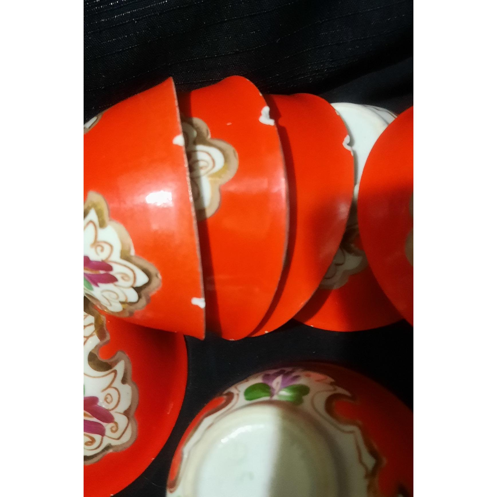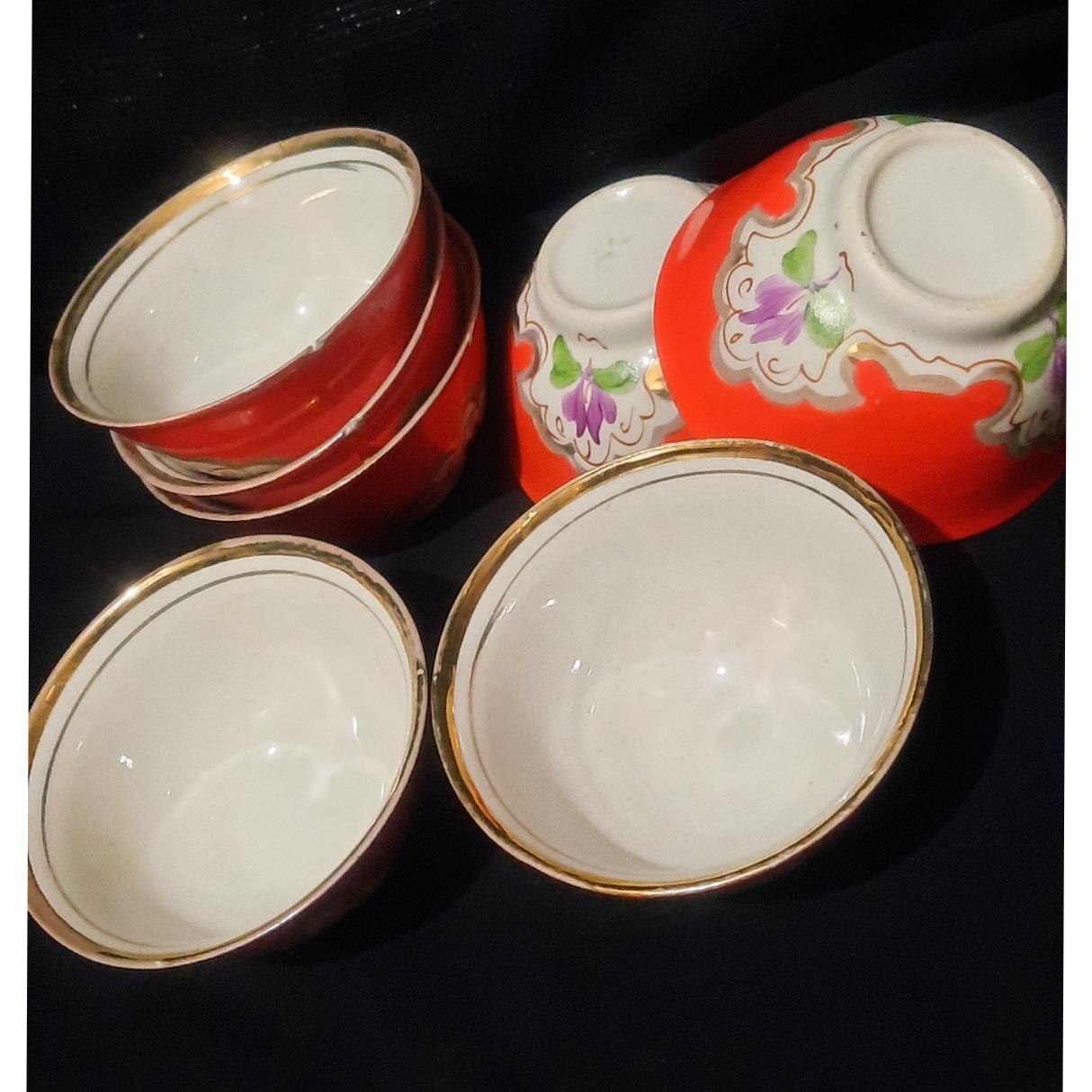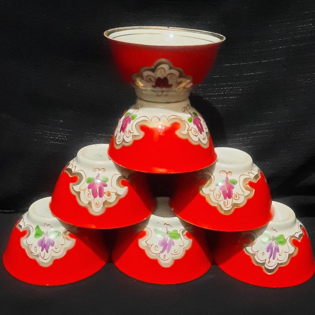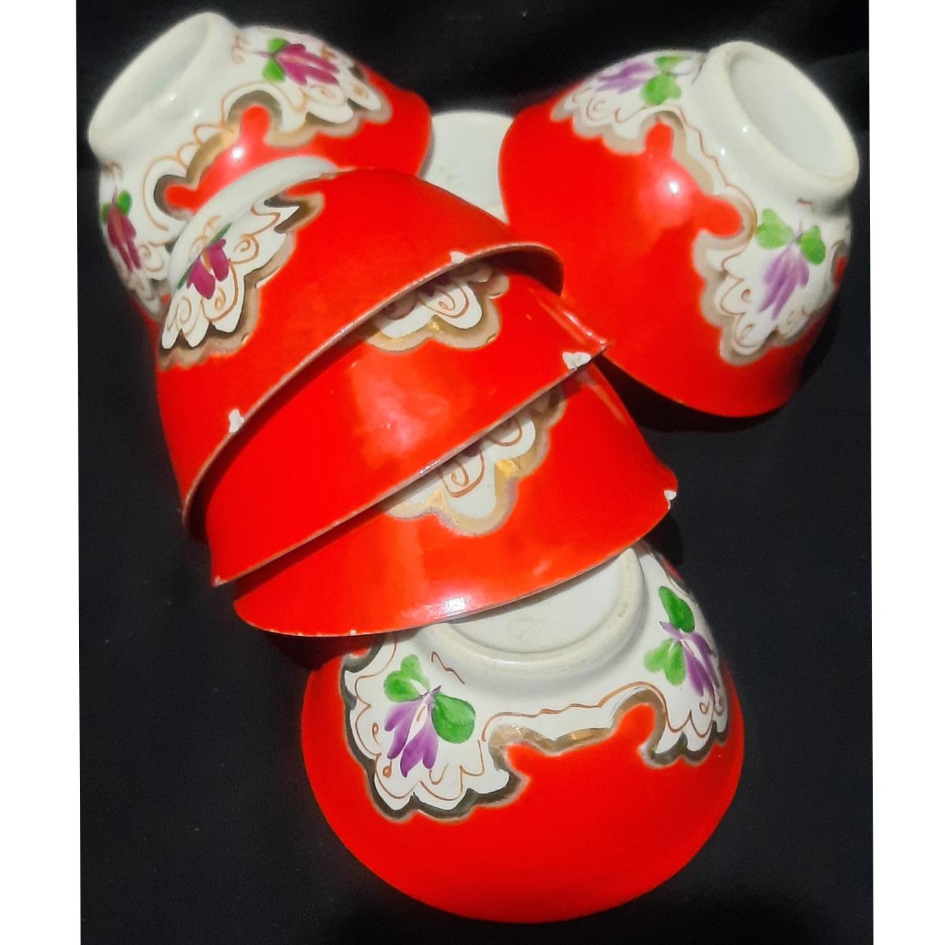 7 عدد پیاله ترشی خوری روسی قطر 8 دست ساز نقاشی با دست و آب طلا توجه بفرمائید سه تا از پیاله ها لبپری دارند یکیشان در دو نقطه لبپری دارند به علت دستساز بودن نقطه برجسته در دو تاشون وجو دار رنگ رفتگی در بعضی دیده میشود اون سه تا حساب نشده