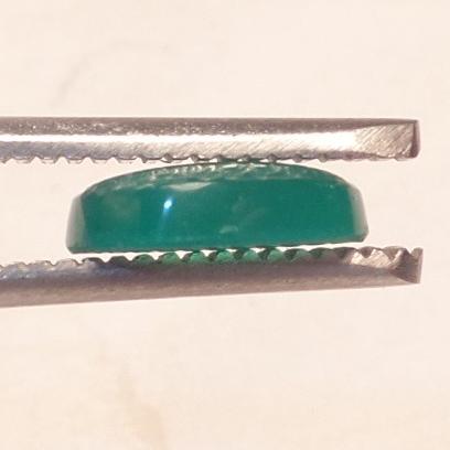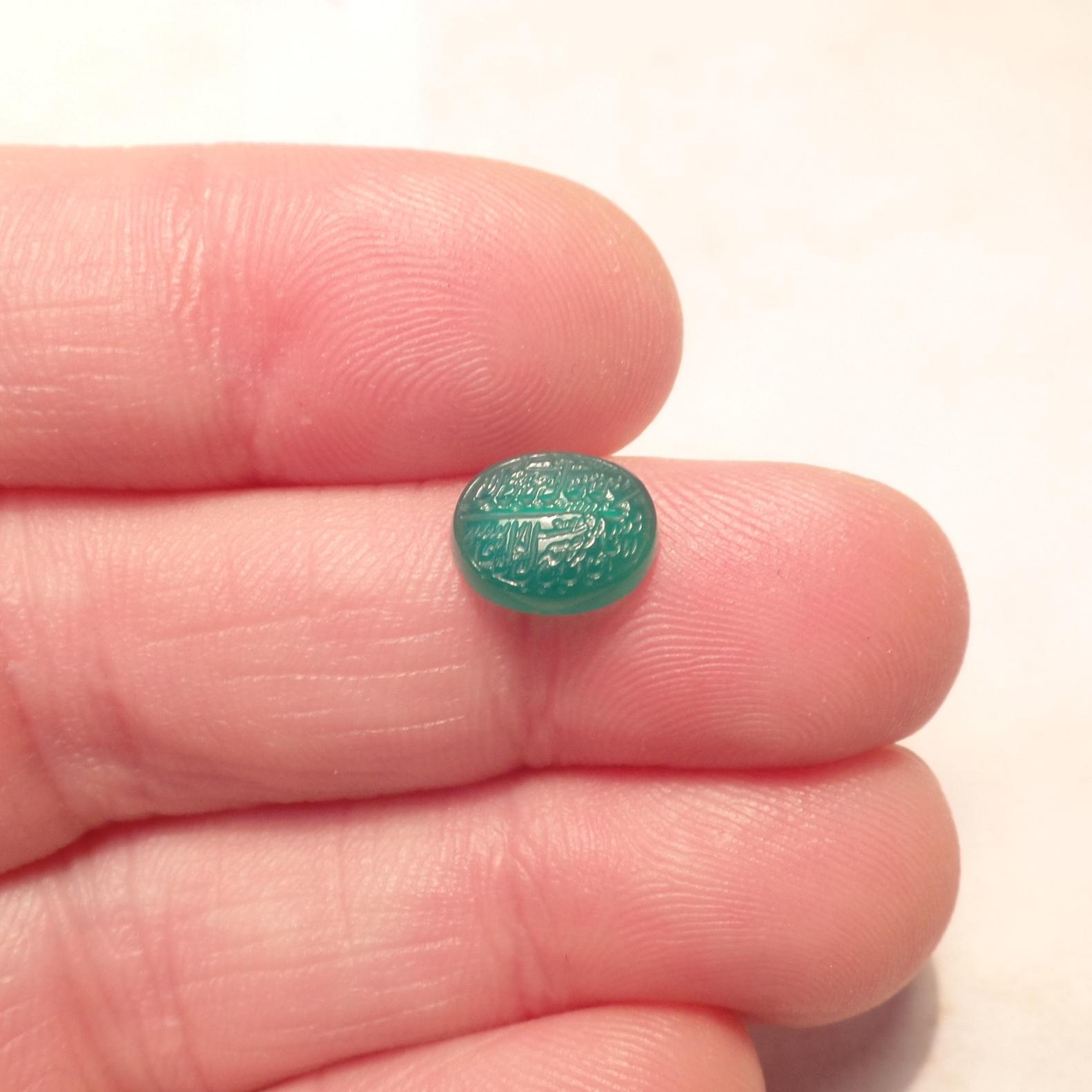 طرح : یک قطعه نگین عقیق سبز بسیار خوش رنگ و بسیار خوش طبع با طبع عالی و شیشه ای و شفاف و با تراش بیضی دیواره دار رو نسبتا محدب و زیر نسبتا تخت که بر روی آن بصورت زیبا و ظریف و مینیاتوری و به سبک نستعلیق و کرسی چینی خوب آیه : ( و من یتق الله ) = ( سوره