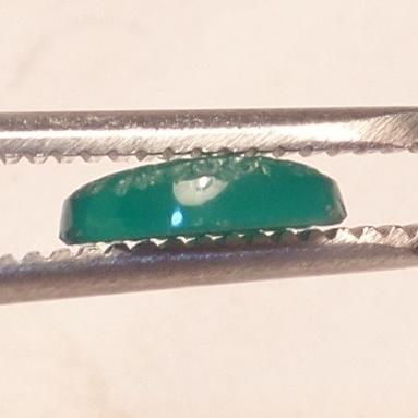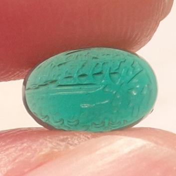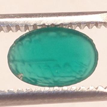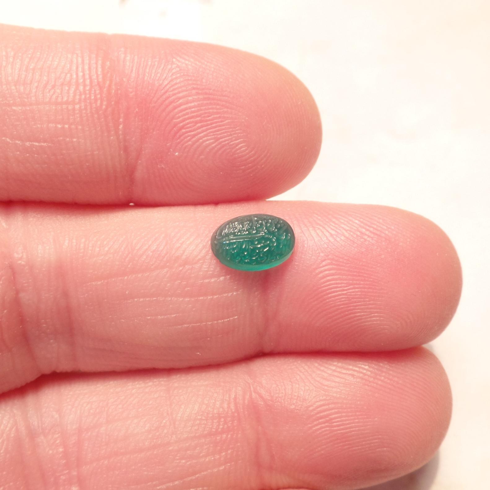 طرح : یک قطعه نگین عقیق سبز بسیار خوش رنگ و بسیار خوش طبع با طبع عالی و شیشه ای و شفاف و با تراش بیضی دیواره دار رو نسبتا محدب و زیر نسبتا تخت که بر روی آن بصورت زیبا و ظریف و مینیاتوری و به سبک نستعلیق و کرسی چینی خوب آیه : ( و من یتق الله ) = ( سوره