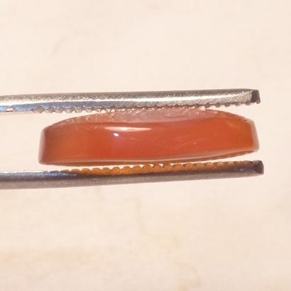 طرح : یک قطعه نگین جزع عسلی خوش رنگ و خوش طبع و لانه زنبوری و با تراش بیضی دیواره دار رو و زیر نسبتا محدب که بر روی آن با خط زیبا و ظریف و به سبک نستعلیق و کرسی چینی خوب آیه : ( و من یتق الله ) = ( سوره مبارکه طلاق آیه 2_3 ) حکاکی گردیده است.