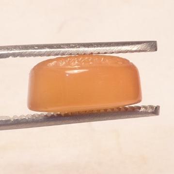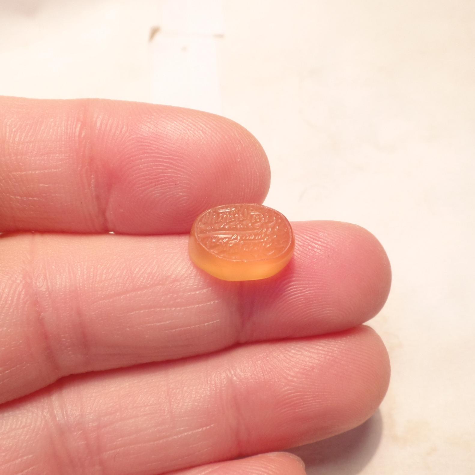 طرح : یک قطعه نگین جزع عسلی خوش رنگ و خوش طبع با رگه های خیلی ظریف و کم و با تراش بیضی دیواره دار رو و زیر نسبتا محدب که بر روی آن با خط زیبا و ظریف و به سبک نستعلیق و کرسی چینی خوب آیه : ( و من یتق الله ) = ( سوره مبارکه طلاق آیه 2_3 ) حکاکی