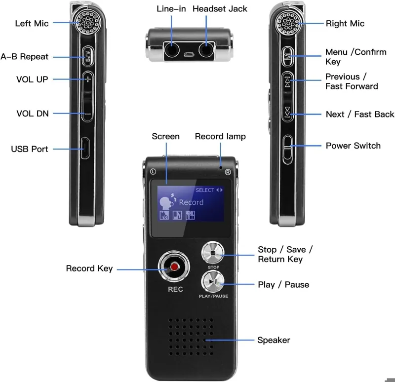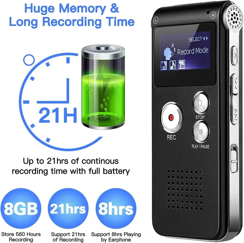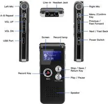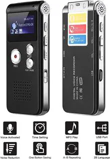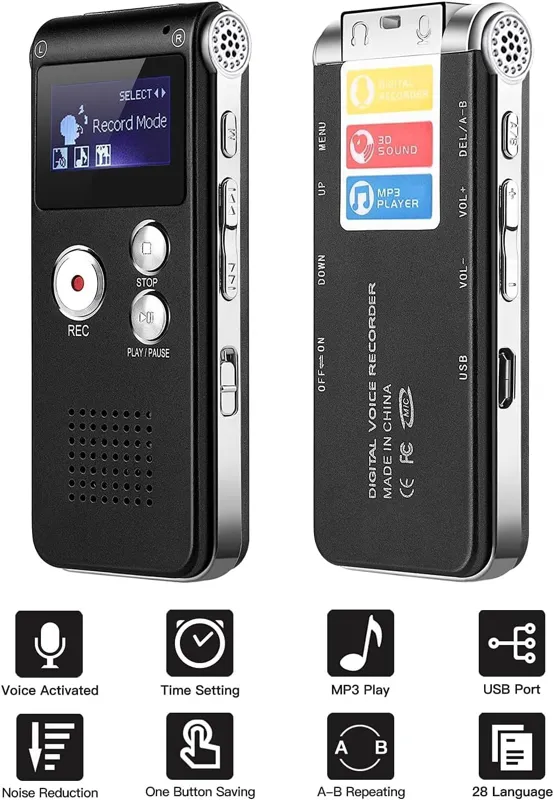 - کوچک و چند منظوره: ضبط صوت دستی کوچک است و تقریباً در هر جیبی جای می گیرد. این خودکار ضبط صدا می تواند برای ضبط فایل های مختلف صوتی مهم و استفاده به عنوان پخش کننده MP3 استفاده شود، دارای عملکرد چندگانه AB تکرار، سوئیچ 22 زبان، عملکرد سریع به جلو، عقب در هنگام پخش است.