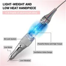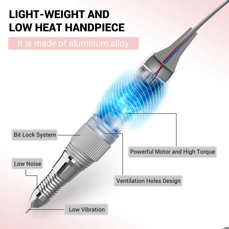 - هندپیس سبک و کم حرارت: ساخته شده از آلیاژ آلومینیوم با کیفیت بالا، مناسب برای استفاده حرفه ای در سالن و استفاده مبتدی در خانه. (با انواع بیت های ساقه 3/32 اینچی کار می کند) دارای سیستم قفل چرخشی است که به شما امکان می دهد بیت را به راحتی تغییر دهید.