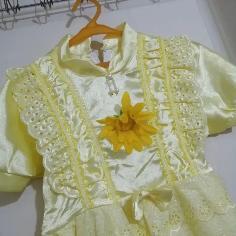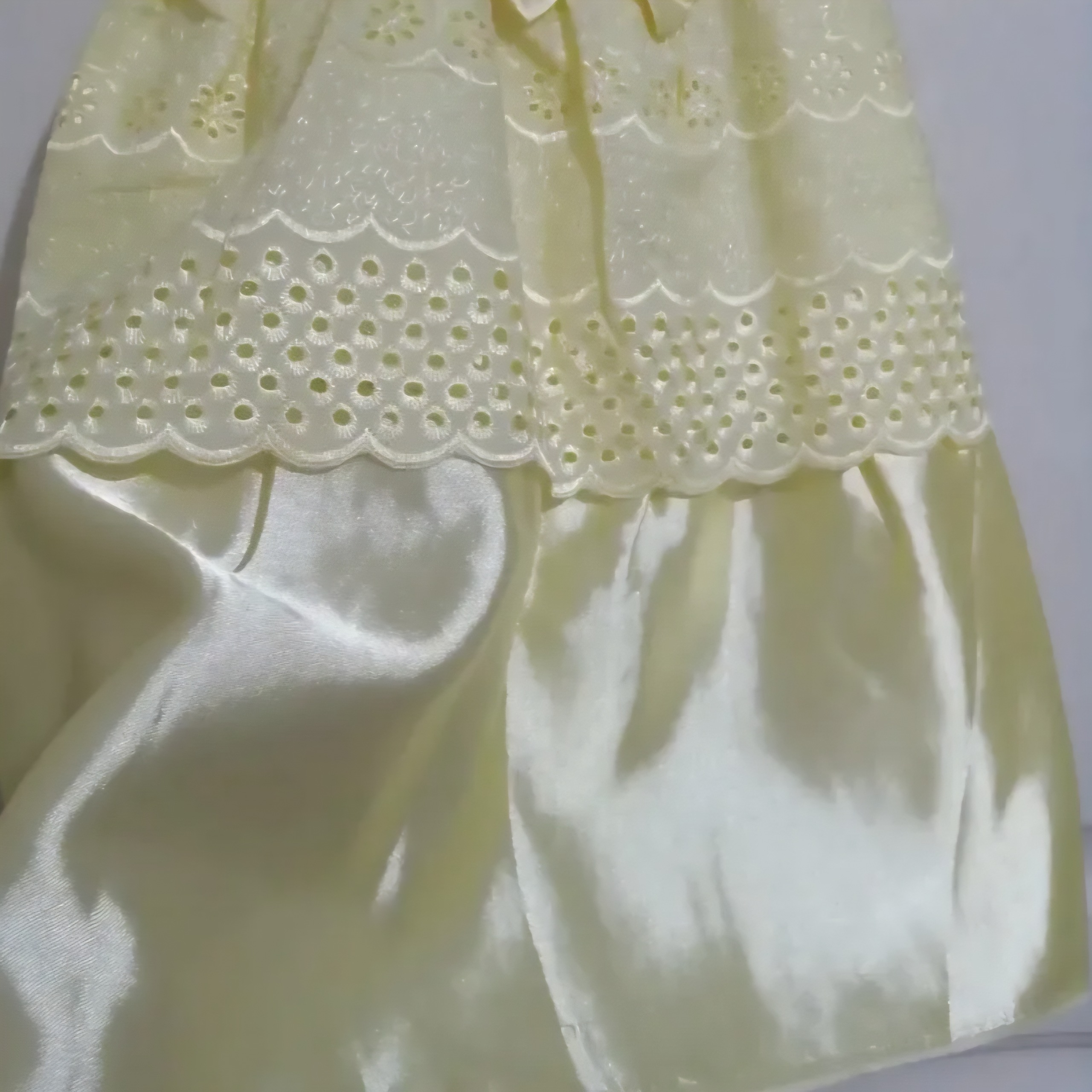 بسیار زیباست و با تم گل آفتابگردان هست کاملا نو هست و سوغاته و ایرانی نیست جنسش خیلی خوبه و ساتن و گیپور هست پشتش کمربند داره و زیپ میخوره رنگش لیمویی هست شاید کمی تو عکس ها فرق کنه