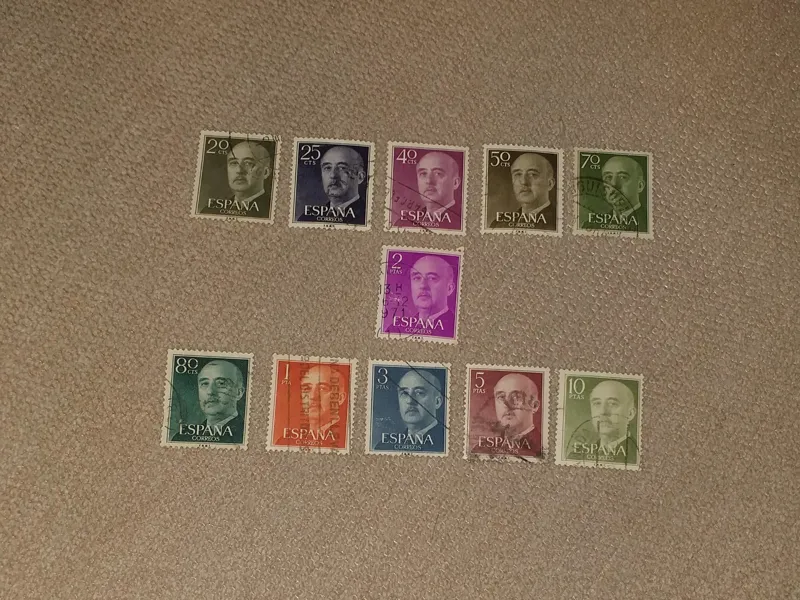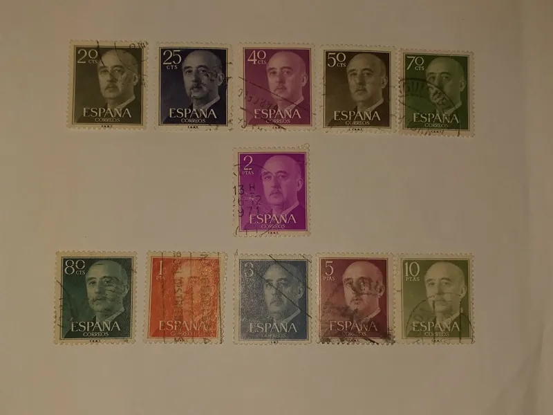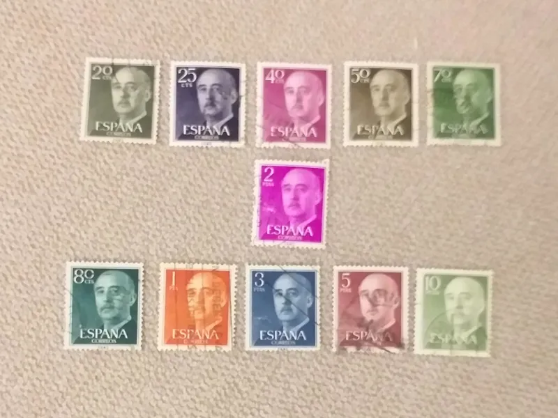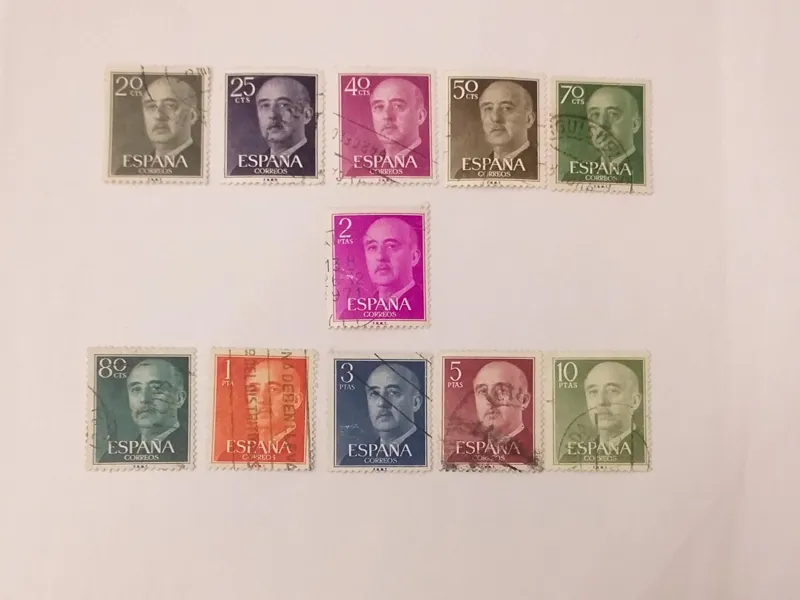 11 تمبر از سری کمیاب 1954 اسپانیا با رقمهای کمیاب و ارزشمند ( فقط تمبر 2PTS یاسی بدون مهر 13/5 دلار در کتاب اسکات 2007 قینت گذاری شده ) ، تمبرها همگی مهر خورده و دست دوم ، با کیفیت خوب در حد نو مطابق تصاویر میباشند