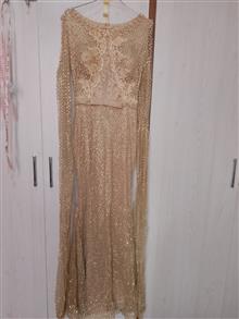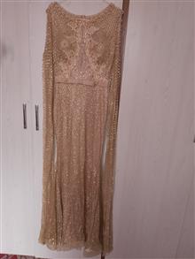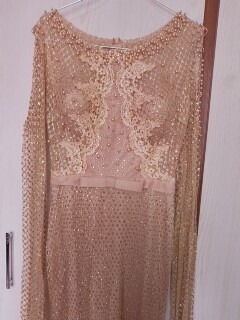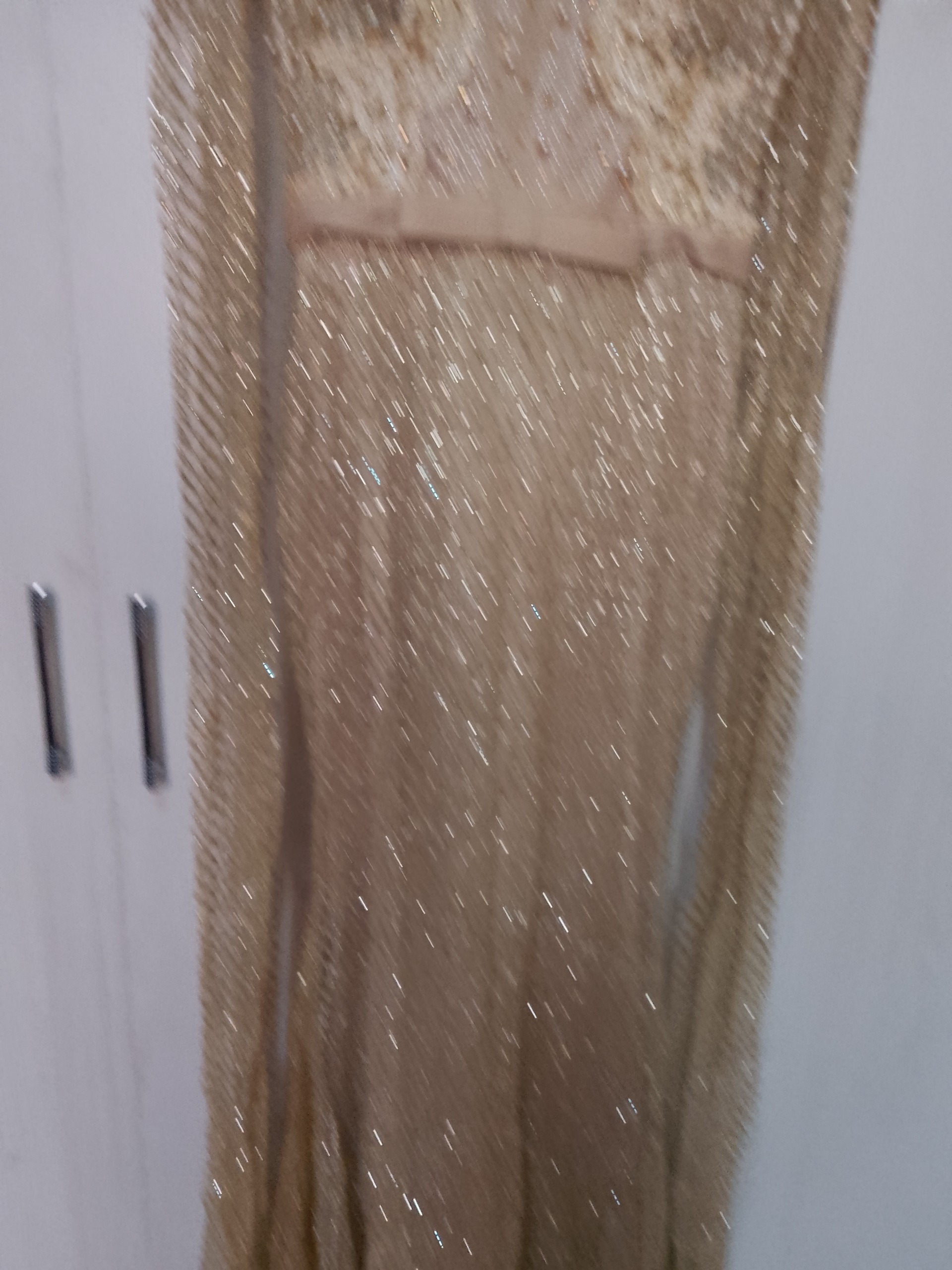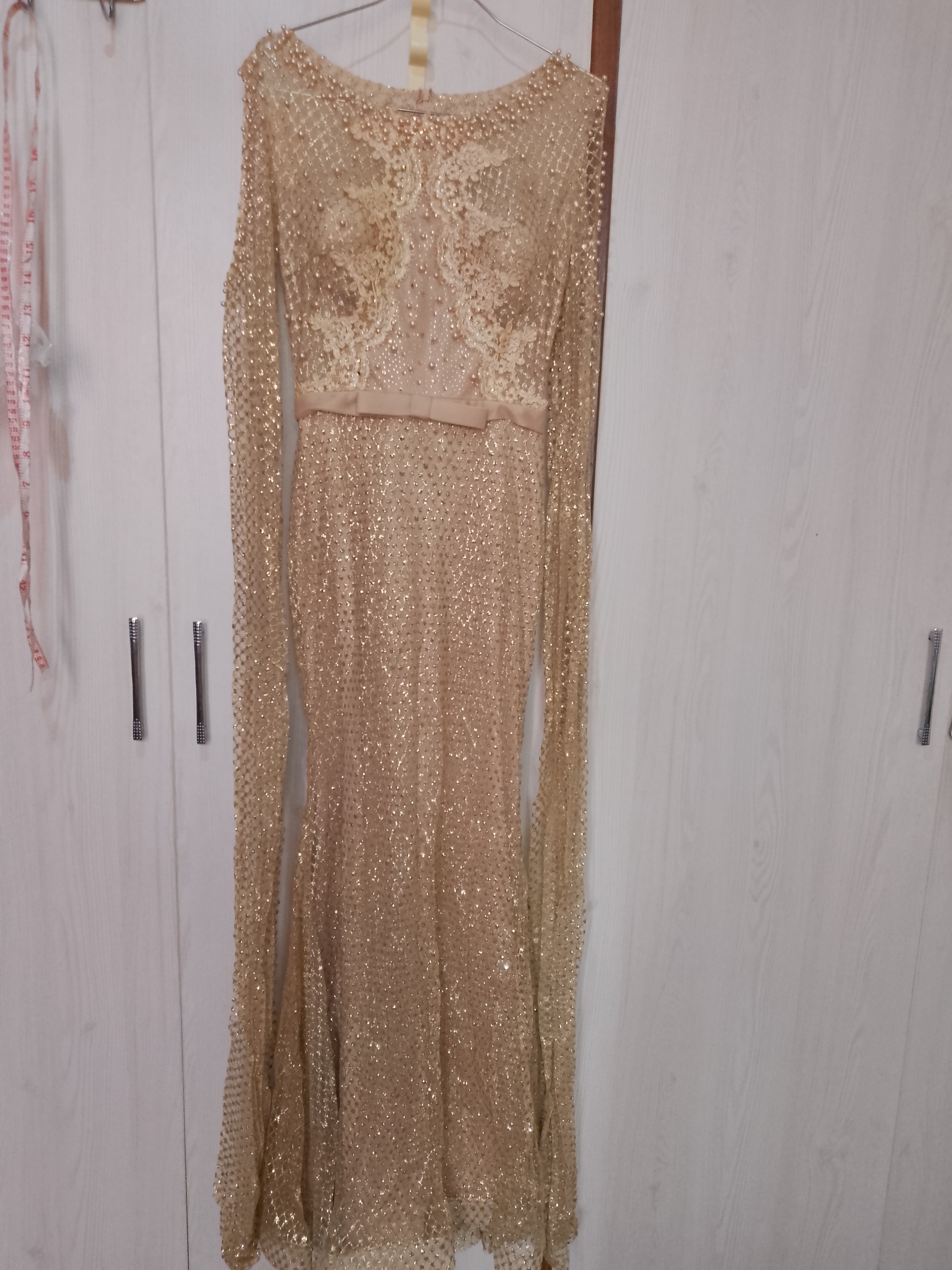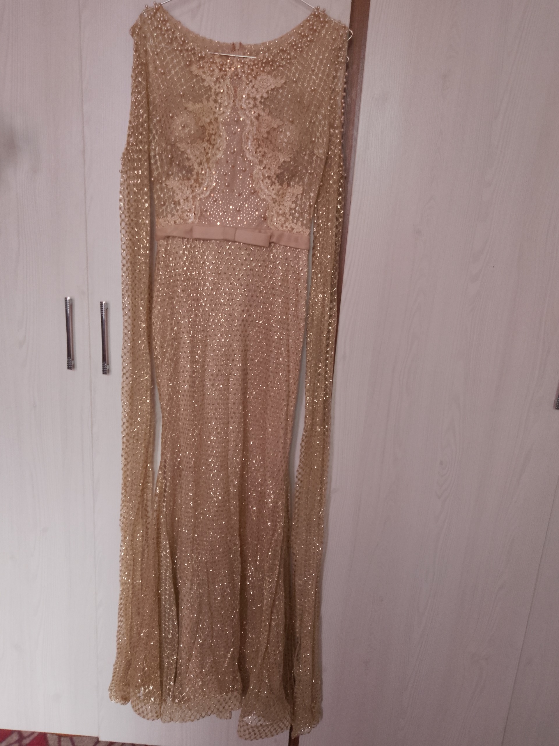 لباس مجلسی یکبار استفاده شده نیم تنه بالا کارشده خیلی شیک با تنخور خاص رنگ کرمی طلایی استین لباس از قسمت ارنج باز هست و بقیه تا پایین کنار دست میفته مثل حالت شال روی دست
