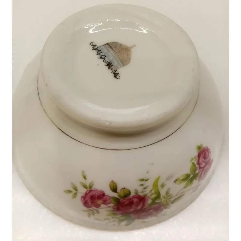 1عدد کاسه گلسرخی ژاپنی سفارش اخوان نواب اصفهان متعلق به دوره پهلوی با قطر دهانه 13 سانتیمتر. قیمت برای 1عدد کاسه میباشد.رنگ گلها درقسمتی از داخل کاسه بصورت یک خط دوسه سانتی از بدو تولید درکارخانه کشیده شده که چیزخاصی نیست.