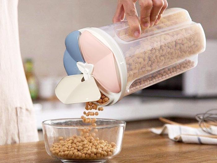 ظرف سه قسمتی حبوبات ، محصولی با طراحی خلاقانه و کاربردی با قابلیت تبدیل می باشد . این ظرف از جنس پلاستیک مقاوم و با کیفیت تولید شده . محفظه داخلی ارگانایزر حبوبات مجهز به سه دیواره متصل به یکدیگر است که فضای ظرف را به سه قسمت مجزا تبدیل می کند که از هر کدام از محفظه ها می توان برای نگهداری مواد غذایی مختلف نظیر حبوبات استفاده نمود . اما قابلیت برداشتن دیواره ها به شما این امکان را می دهد تا فضای داخلی محفظه را به یک محفظه برای ایجاد امکان استفاده حداکثری از آن تبدیل کنید . بر روی دهانه ظرف نیز پوششی با سه خروجی مجزا و درب روی آنها تعبیه شده که هر کدام از خروجی های بر روی یکی از محفظه ها قرار می گیرد و می توان با استفاده از ان محتویات درون محفظه را به میزان دلخواه تخلیه نمود . این ویژگی امکان استفاده سریع و آسان از مواد غذایی داخل ظرف را خواهد داد . از باکس حبوبات 3 خانه با ظرفیت 2500 میلی لیتر می توانید در آشپزخانه به جای چند ظرف برای نگهداری و همچنین دسترسی سریع و آسان به مواد غذایی مختلف نظیر حبوبات ، ادویه و ... استفاده کنید .