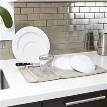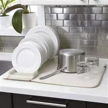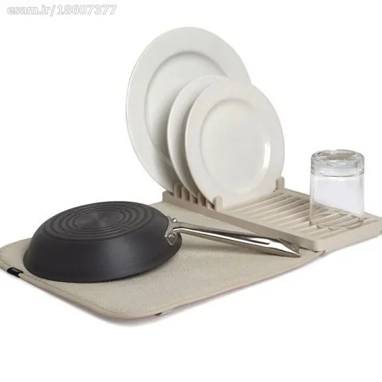 این محصول متشکل از یک پد نمگیر با ضخامت مناسب برای آبگیری ظروف شسته شده و یک استند برای قرار دادن ظروف مختلف با ابعاد کوچک نظیر بشقاب ، چاقو ، کفگیر و ... است . استند ظروف از جنس پلاستیک مقاوم و با کیفیت تولید شده که قابلیت جداسازی و همچنین اتصال آسان به پد در صورت نیاز را دارد ، بنابراین می توانید جهت شست و شوی نمگیر ، آن را از استند جدا نمایید . بارزترین ویژگی آبگیر ظروف کنار سینک را می توان قابلیت تاشدن پد بر روی استند و همچنین جابه جایی آن عنوان نمود ، بدین ترتیب که در صورت عدم نیاز به پد می توانید به سادگی آن را بر روی استند تا کنید تا فضای بسیار کمتری را داخل کابینت ، کشو و ... برای نگهداری اشغال نماید ، از سوی دیگر امکان جابه جایی آسان آن را داشته باشید .
