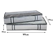 کاور پتو و لباس زیر تختی ، محصولی با طراحی جدید و عملکردی بسیار کاربردی ، ارائه شده در بسته بندی1  عددی می باشد . این کاور از جنس پارچه کاوری (اسپان باند) و در رنگ طوسی تولید شده که می توان ابتدای معرفی آن را ابعاد باریک و جالب توجه محصول عنوان نمود . ویژگی ای که بسیار می تواند به شما در جای دادن کاور ، زیر تخت که دارای فضایی با ارتفاع کم و محدود دارد ، کمک کند . بنابراین با استفاده از این ارگانایزر می توانید از فضای زیر تخت خواب نیز به بهترین شکل ممکن بهره ببرید ، بدون اینکه شاهد بی نظمی و نامرتبی وسایل قرار گرفته در آن باشید . در جلوی کاور دو بند پهن به عنوان دستگیره تعبیه شده است که با استفاده از آنها می توانید به سادگی کاور پتو زیر تختی را از زیر تخت بیرون کشیده و پس از استفاه مجدداً در زیر تخت و مشخصاً جایگاه مناسب خود قرار دهید .