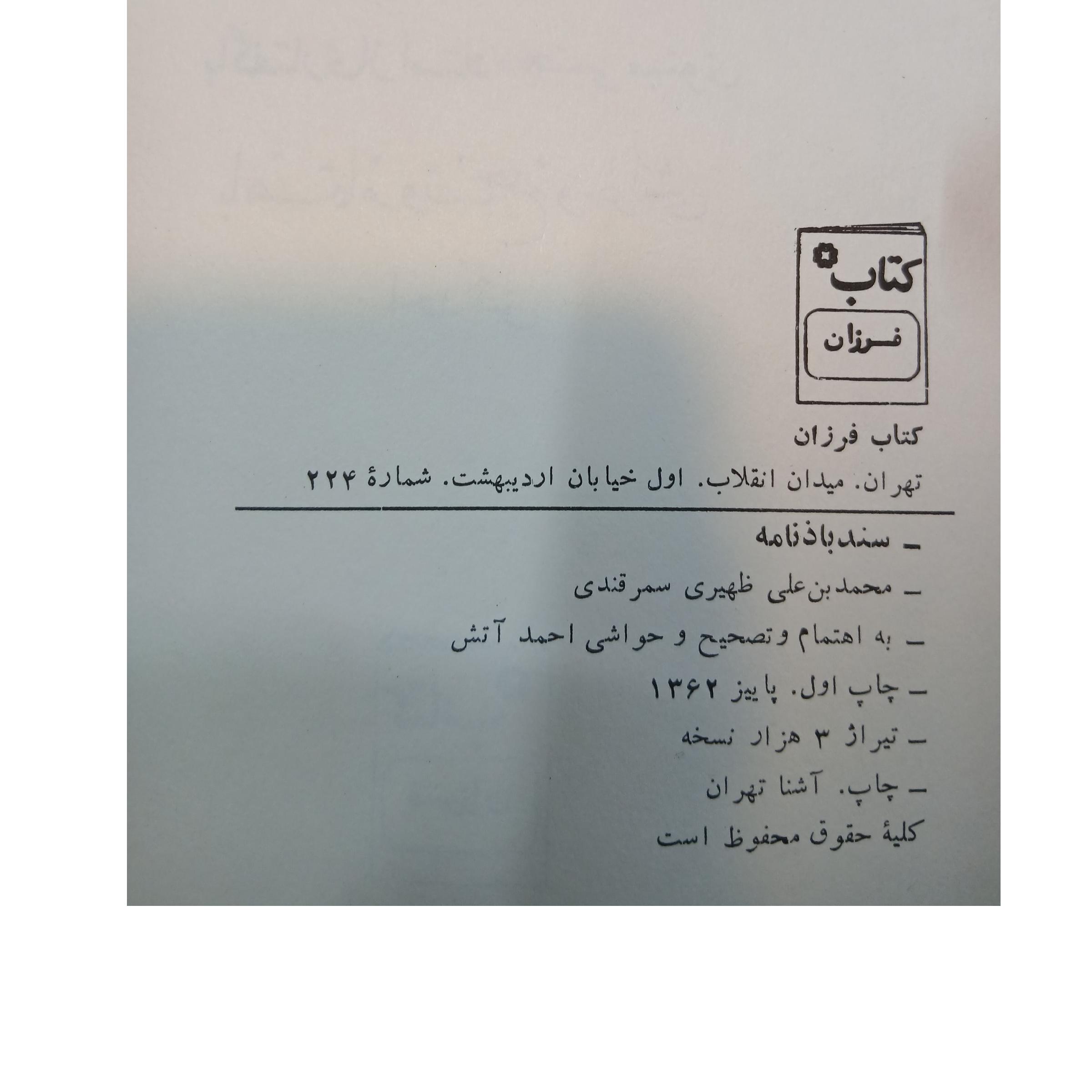 کتاب سندباذ نامه نشر فرزان چاپ اول 1362 با پیشگفتار از مجتبی مینوی،کتاب بسیار تمیز و با کیفیت ،کتاب بدون کاور هستش