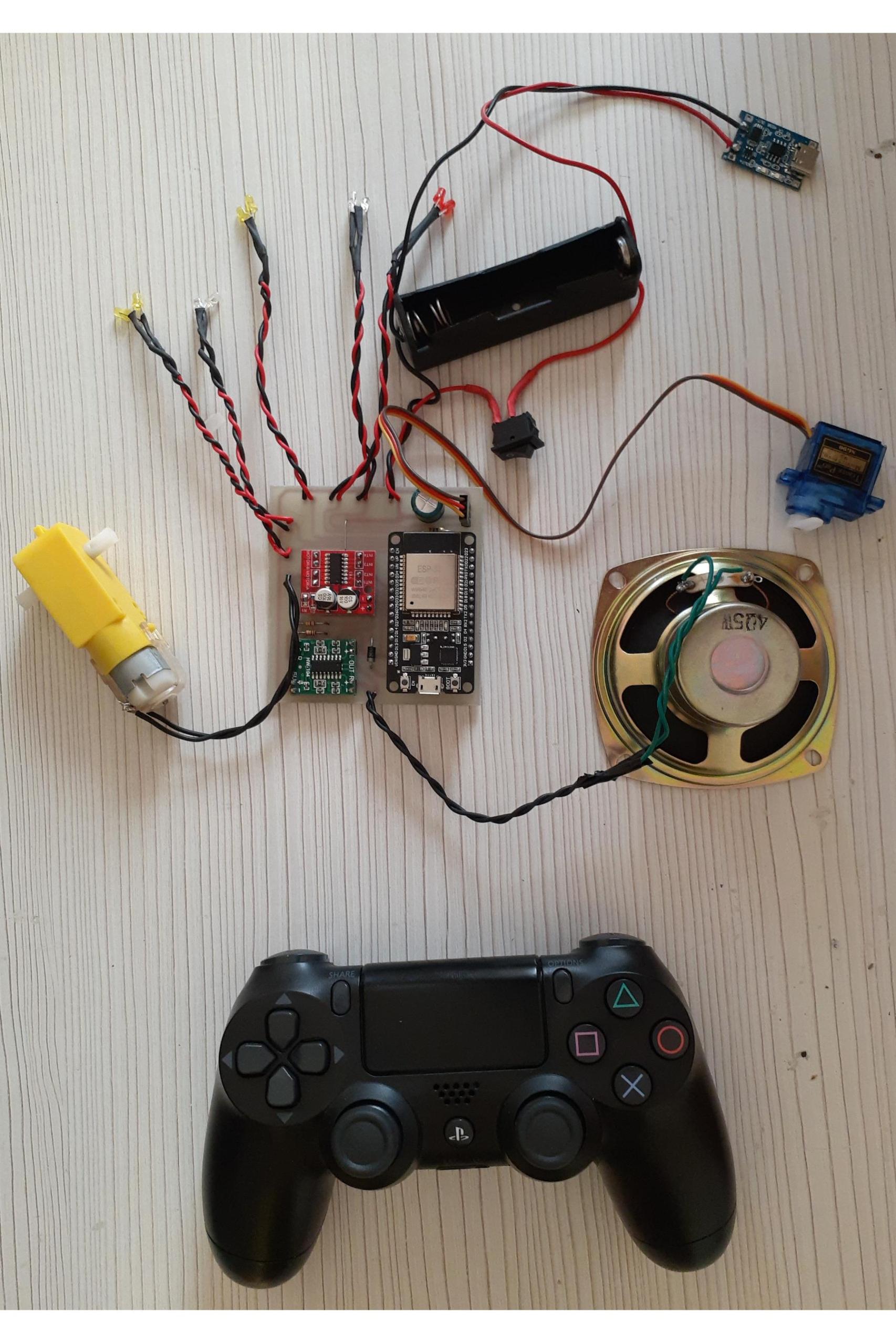 این پروزه تشکیل شده است از برد کامل با ESP32  کد برنامه نوشته شده بر رور ESP32 اپلود شده است با یک موتور و یک سرو موتور جهت چرخ جلو چرخاندن به چپ و راست و موتور دیگر برای چرخ عقب که ماشین ارسی را به حرکن در بیارد فرمان گیری این پروژه با یک دسته پلی استیشن PS4  میباشد .