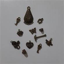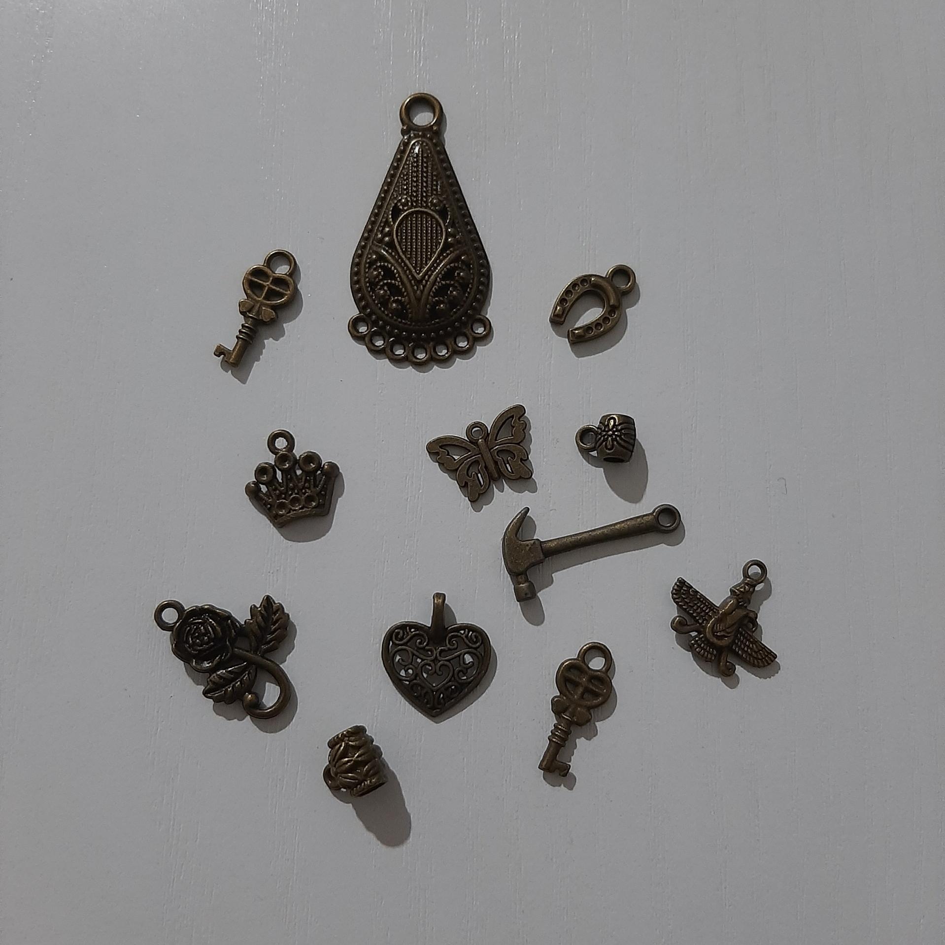 خرج کار زیورآلات ، 12 عدد آویز گردنبند و دستبند که همه دارای یک حلقه هستند . در صورت خرید آیتم دقیقا تعداد و نوع آویزها مثل تصویر ارسال خواهد شد . رنگ آویزها برنزی است .
