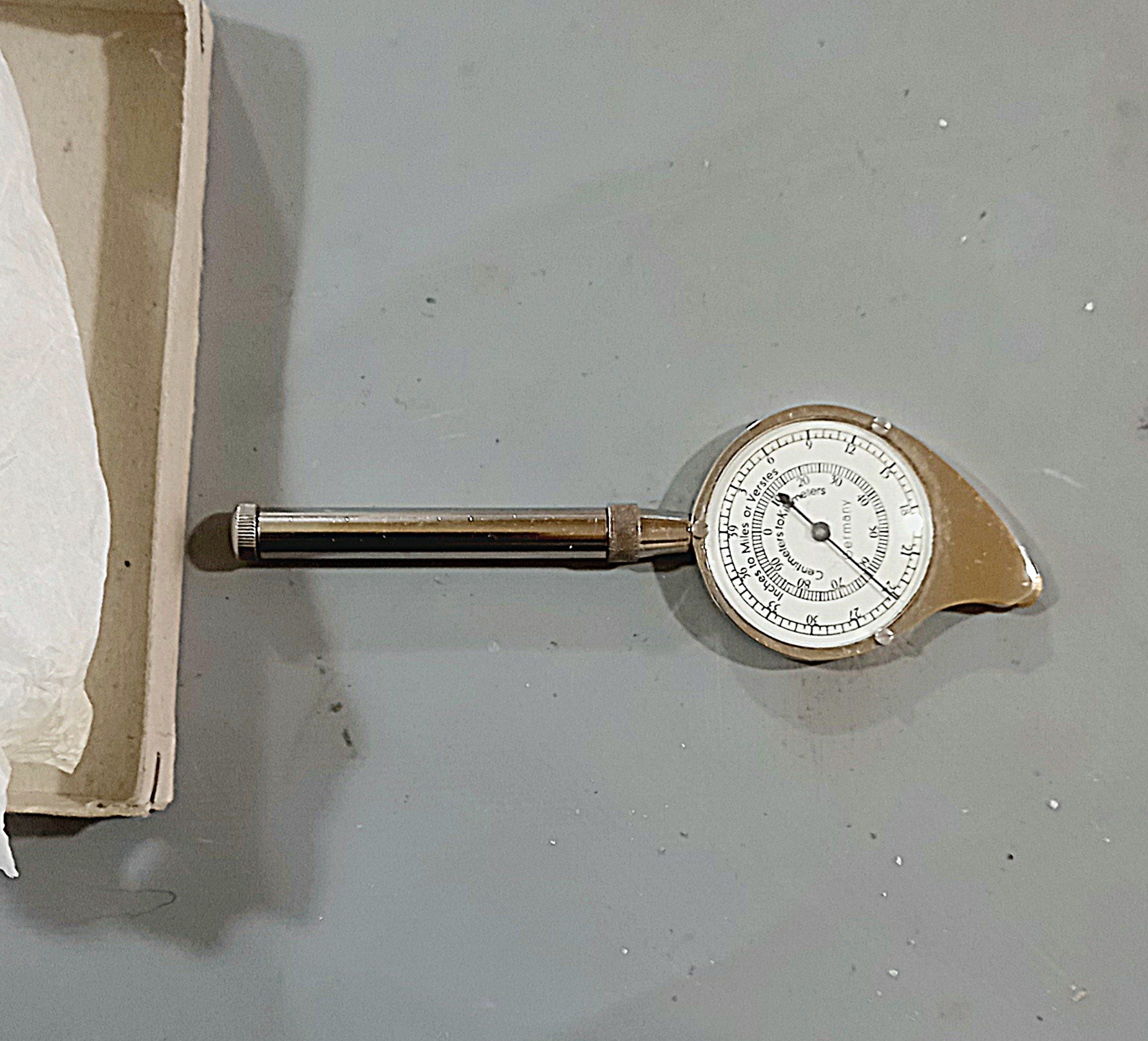 متر مدور آلمانی برند پست بسیار کمیاب و نا پیدا البته اینجوری نونو در داخل جعبه فابریک خودش بسیار کمیاب هستش .کاربردش هم طوری هست که وقتی روی یک خطی که کشیده شده این رو میکشی دقیقا نشون میده جند سانت و میلیمتر میباشد دقیقا مطابق تصاویر