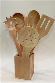 ست کفگیر ملاقه چوبی 7 پارچه چوبلمه ، محصولی با طراحی ترکیبی فانتزی و کلاسیک که زیبایی و جلوه ای منحصر به فرد را برای آن پدید آورده . 6 ابزار چوبی این ست شامل کفگیر برنج ، کفگیر کتلت برگردان ، کفگیر ماکارانی ، قاشق و چنگال آشپزی و ملاقه می باشد که همگی درون یک استند مکعبی شکل با امکان قرار گیری بر روی سطوح مختلف نظیر کابینت ، میز ، کنار اجاق گاز و ... جای داده می شوند . سرویس آشپزی چوبلمه تولید شده از جنس چوب مرغوب و باکیفیت می باشد که سطحی کاملاً سیقلی و یکدست برای استفاده آسان دارد . چوبی بودن ست ابزار ، قابلیت استفاده از آنها برای ظروفی نظیر تفلون با سطح داخل حساس در برابر خراشیدگی را نیز محیا نموده ، پس با خیالی آسوده از آن برای طبخ ، آماده سازی و یا حتی سرو غذا بر روی میز استفاده کنید.