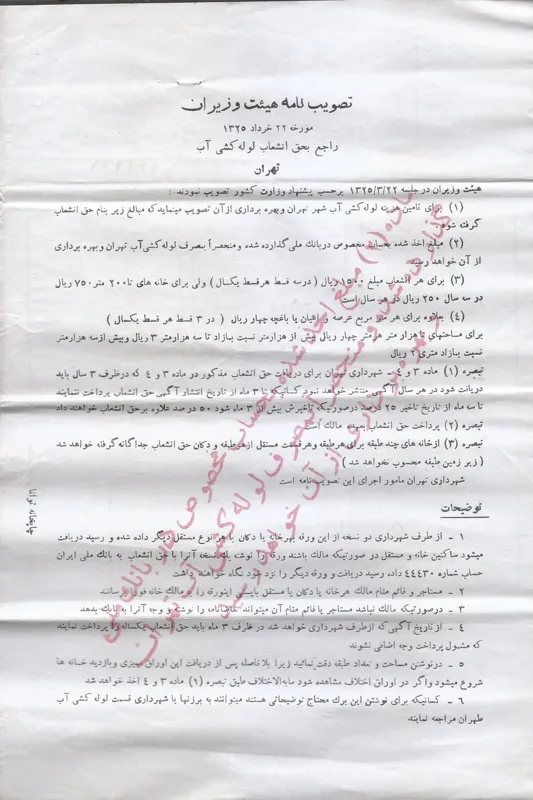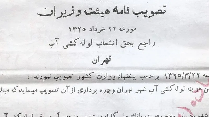 پشت برگه : تصویب نامه هییت وزیران مورخه 22 خرداد 1325 راجع بحق انشعاب لوله کشی آب تهران