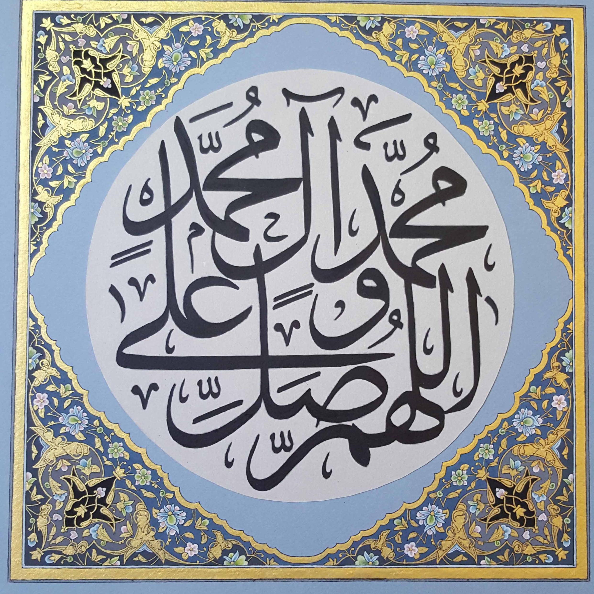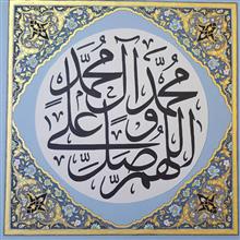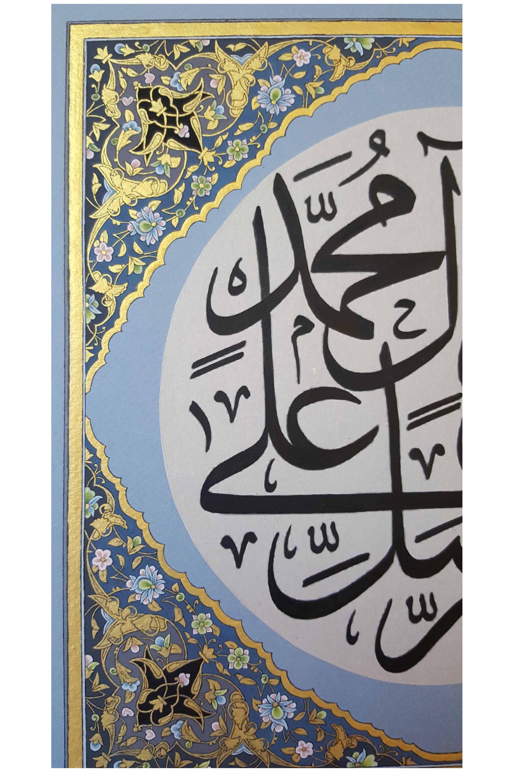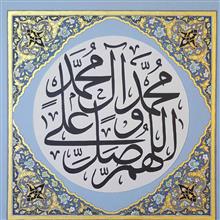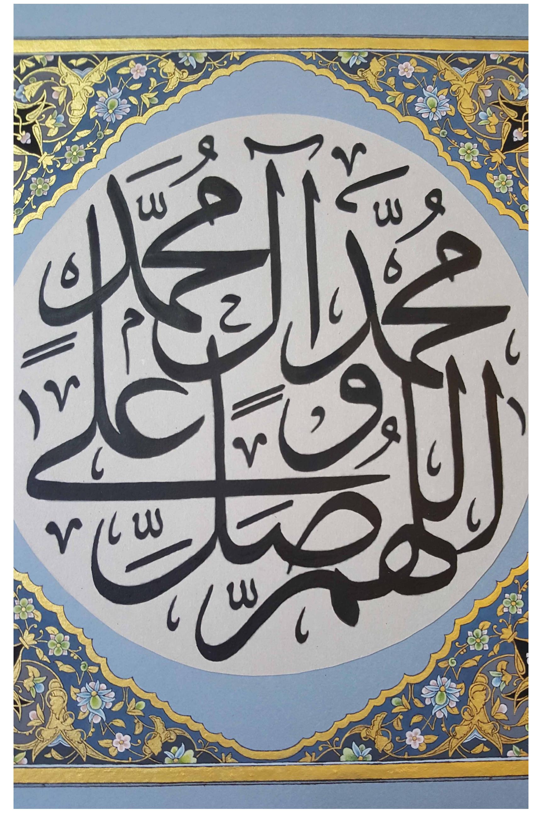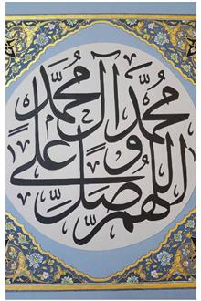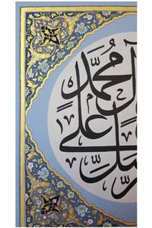 تابلو خوشنویسی صلوات اثری بسیار فاخر و ممتاز با تذهیب فوق العاده عالی و زیبا خوشنویسی بجهت استحکام و ماندگاری با رنگ اکریلیک اجرا شده است
